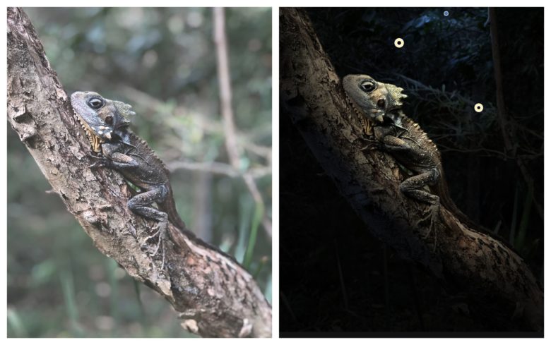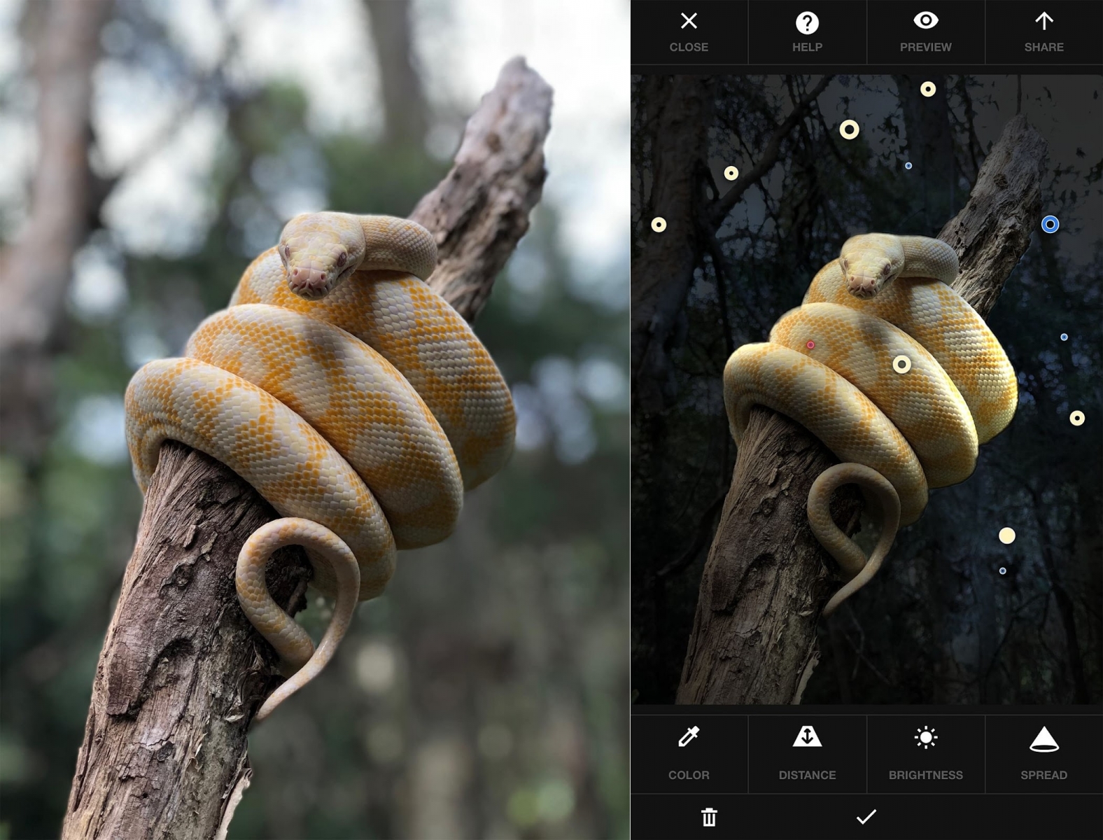 Folosind aceasta aplicaţie puteţi scoate in relief o şopârlă pe o ramură, întunecând fundalul, aşa cum se vede mai sus spre exemplu. Orice fotografie făcută în mod Portrait beneficiază de această noutate. Veţi putea reveni asupra sa şi "mişca luminile", ca şi cum aţi avea o încăpere cu reflectoare pe care le mutaţi fizic. Sunt suportate telefoanele următoare: