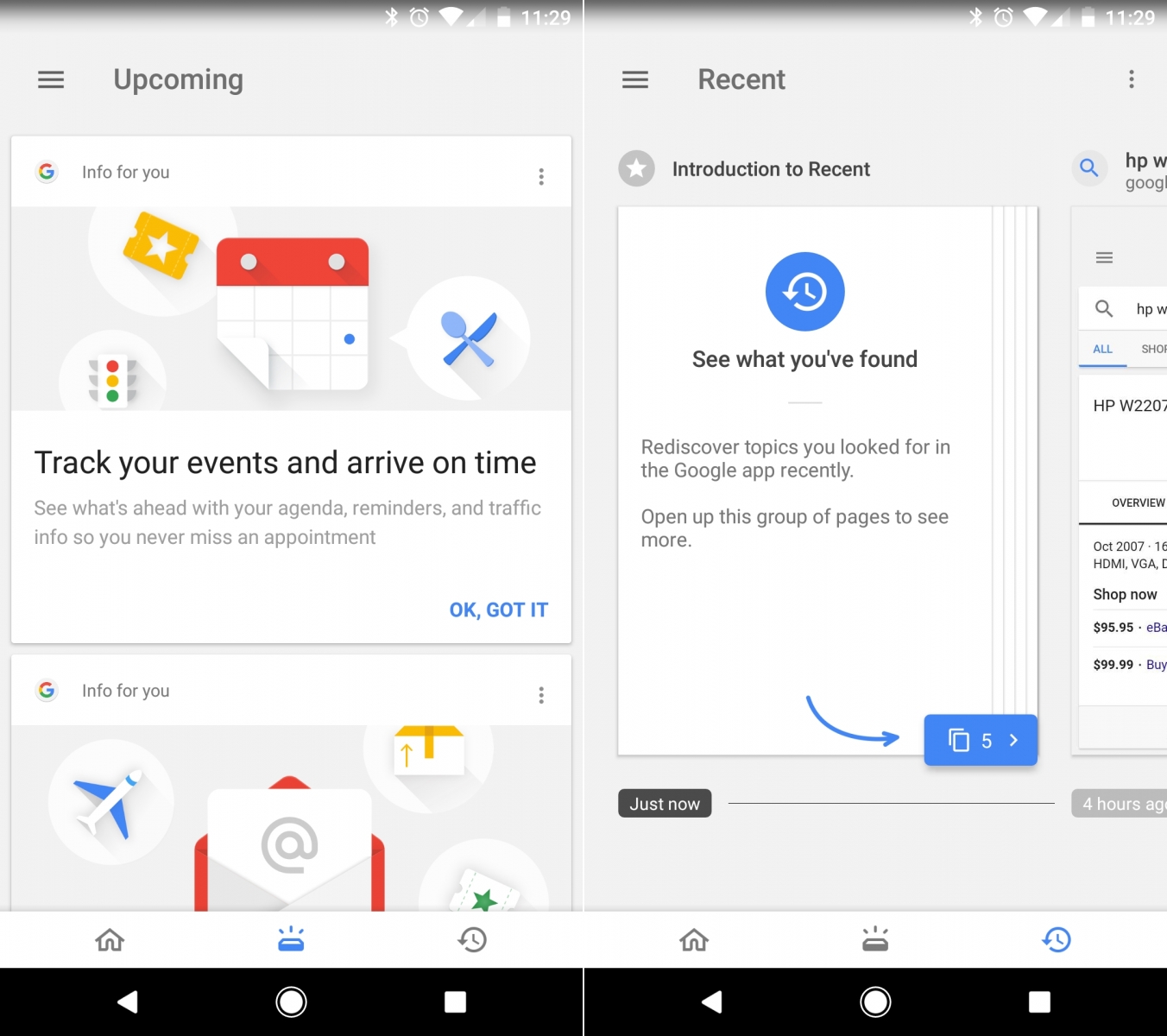 Acum suntem în faza în care Google oferă funcţionalitatea pentru mai mulţi utilizatori, posibil chiar pentru toţi, deşi nu putem garanta acest lucru. Practic, odată ce deschizi aplicaţia Google o să vezi 3 taburi în zona inferioară: Home, Upcoming şi Recent. Avem capturi de ecran în acest articol pentru a exemplifica abordarea. Home include articolele recomandate, Upcoming include mai degrabă remindere sau informaţii despre zborurile cu avionul pe care le aveţi programate. În Recents veţi găsi un istoric cu căutările voastre Google.