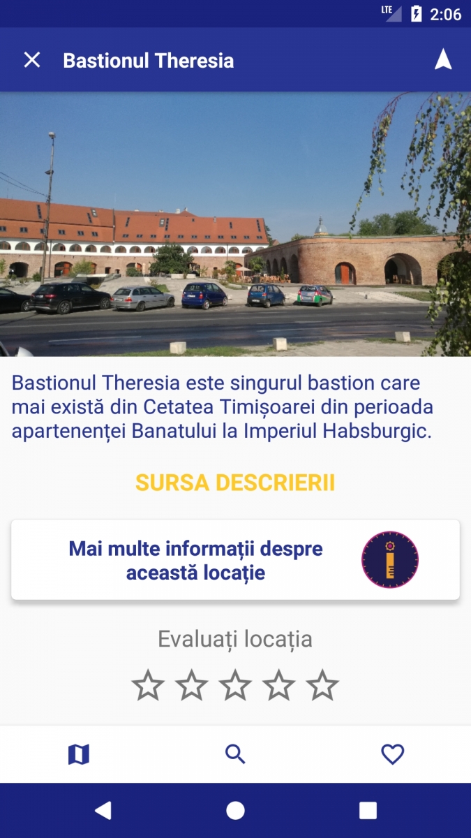 Odată ce accesați pagina cu detalii a unei locații de pe listă veți putea vedea o fotografie reprezentativă, distanța până acolo și o descriere a locului vizat. Folosind Google Maps veți putea naviga la adresa unde se poate găsi de exemplu un muzeu și totodată din România Uimitoare puteți adăuga și o evaluare în stele de la 1 la 5.