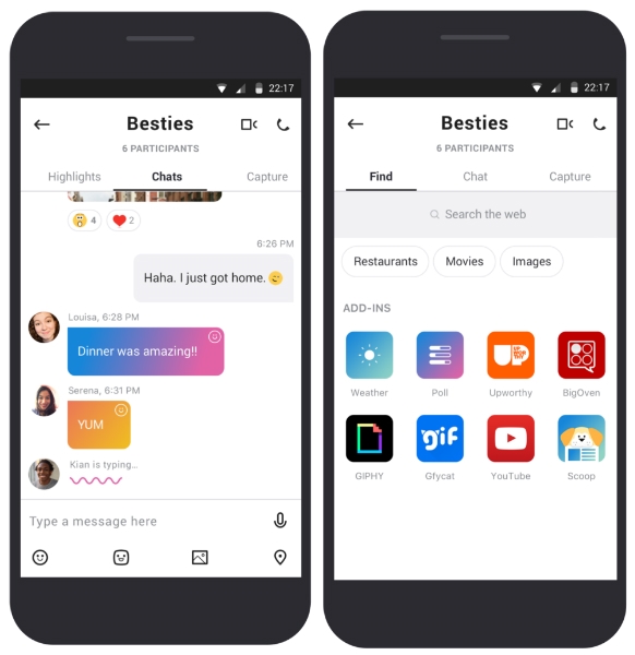 De asemenea, avem și posibilitatea de a reacționa la fotografiile sau mesajele primite în chat cu diferite emoticoane care exprimă starea de spirit și totodată de a schimba culoarea background-ului din zona de mesaje. Aflați că ecranul de chat este împărțit în 3 tab-uri diferite numite Find, Chat și Capture, prima dintre acestea oferindu-ne funcția de a distribui conținut dintr-o altă aplicație fără a părăsi aplicația Skype.