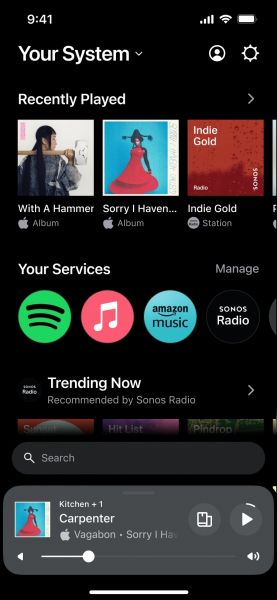 - Control superior al sistemului: Utilizatorii pot glisa în sus atunci când se află pe Home screen pentru a controla cât se poate de fluid întregul sistem și pot astfel accesa o prezentare vizuală a ceea ce este redat pe fiecare dintre produsele Sonos conectate. Aceștia pot și să grupeze boxele și pot ajusta volumul de oriunde din aplicație pentru a obține intensitatea perfectă.