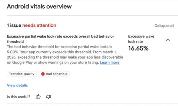 Totul se bazează pe o metrică nouă introdusă de Google sub umbrelă Android Vitals, denumită „Excessive Partial Wake Locks”. Un wake lock parțial este un mecanism care împiedică telefonul să intre în modul de repaus, chiar și atunci când ecranul e stins. Practic, aplicațiile pot menține procesorul activ în fundal, iar asta duce, evident, la descărcarea mai rapidă a bateriei. Google a colaborat cu Samsung pentru a rafina acest sistem, care va analiza cât de frecvent și cât de mult o aplicație abuzează de acest comportament.