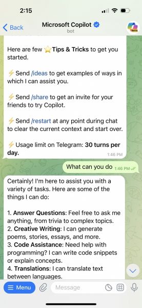 Există și o limită aici: 30 de întrebări și răspunsuri în decursul a 24 de ore. E o limitare ce are ca scop gestionarea resurselor, conform companiei. Putem vedea această opțiune proaspăt ajunsă în Telegram drept un „demo” a ceea ce poate Copilot. Evident, Microsoft încearcă să direcționeze o parte din utilizatorii Telegram spre aplicația oficială Copilot și spre planurile sale cu plată, pentru a folosi chatbot-ul nelimitat.