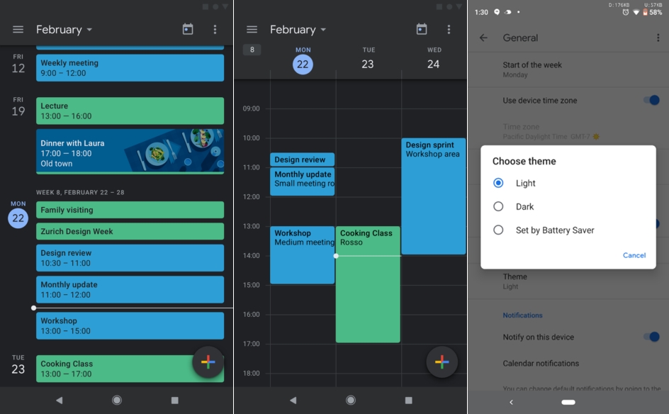 Google deja a actualizat aplicațiile Messages, Calculator, Contacts și Keep cu un astfel de Dark Mode, iar acum este rândul și soluției Calendar să beneficieze de noul look. Această temă întunecată are și rolul de a economisi energia și prezintă o interfață mai plăcută pentru privirea utilizatorului.