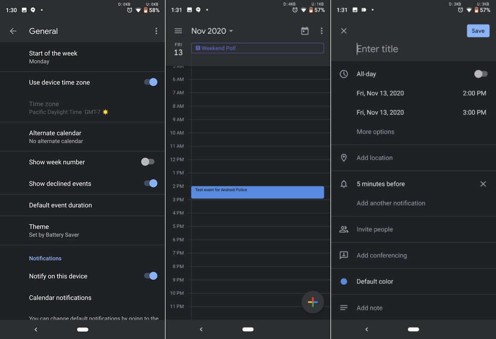 Suntem informați că acest nou feature se va distribui către toți utilizatorii până la final de lună, dar și că există o modalitate prin care ne putem bucura de modul cu pricina mai devreme. Putem face asta prin instalarea apk-ului de aici (descărcare) și mai sus aveți câteva capturi de ecran care prezintă Google Calendar în varianta nocturnă.
