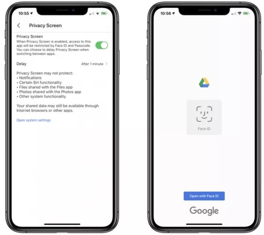Veţi putea vizualiza fişierele din cloud doar dacă fata scanată corespunde cu cea înregistrată pe telefon. De fiecare dată când intri în aplicaţie ţi se cere autentificarea şi poţi seta şi intervalul trecut până este solicitată scanarea facială din nou, precum 10 secunde, 1 minut, 10 minute. Accesul la Google Drive nu este totuşi 100% blocat şi poate fi fentat totuşi prin partajarea de fişiere cu aplicaţia Files şi anumite funcţii asociate lui Siri.