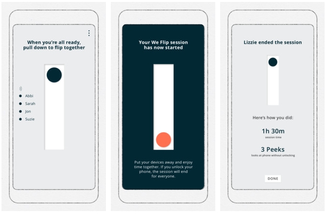 Trecem mai departe și descoperim aplicația We Flip, acest nume fiind purtat și de către experimentul social pentru întâlnirile între grupuri de prieteni. Ce presupune acest concept este adunarea telefoanelor într-un coșuleț sau plasarea lor unul peste altul într-un turn. Prima persoană care își ridică telefonul să verifice notificările pierde și în unele cazuri se pariază pe plata notei de la restaurant.
