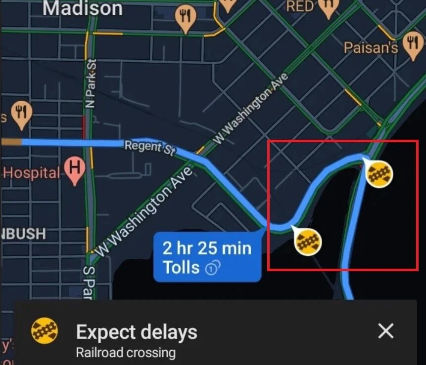 Avertizarea va fi afișată sub forma unei notificări în zona inferioară a ecranului, cu mențiunea că am putea întâmpina întârzieri din cauza sa. De asemenea, așa cum puteți remarca în captura de ecran de mai sus, zona respectivă va fi marcată cu o iconiță galbenă ce prezintă trecerea la nivel cu calea ferată.