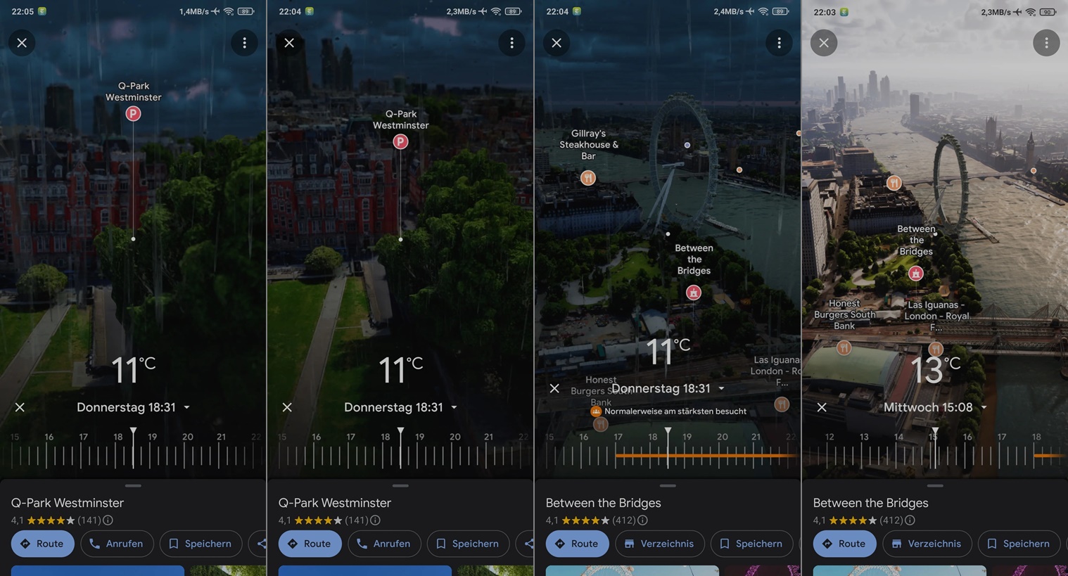 Conform utilizatorilor Reddit care au încercat funcția, sunt adăugate doar câteva orașe până acum: Londra, Los Angeles, New York, San Francisco și Tokyo. Totuși, urmează să suporte acest feature și Berlin, Amsterdam, Dublin, Florența și Veneția. În acest mod de vizualizare utilizatorii vor vedea atât starea vremii, cât și traficul în timp real. De asemenea, sunt prezentate aici și obiective turistice, monumente, locații importante, într-o manieră 3D.