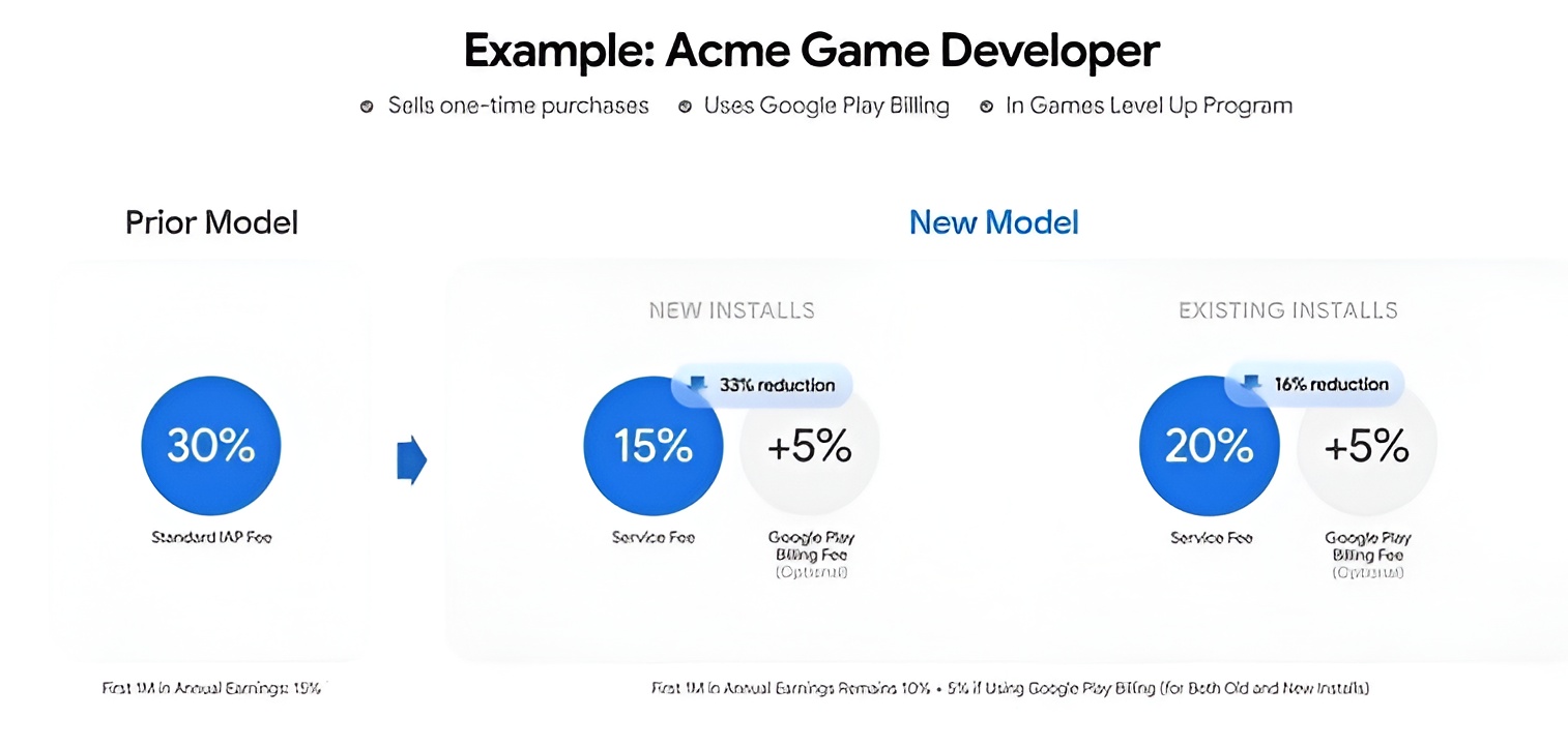 În noul model, Google introduce o taxă de facturare separată, stabilită în funcție de piață. În Spațiul Economic European, Marea Britanie și SUA, aceasta va fi de 5%. În același timp, taxa de serviciu pentru achizițiile din aplicații va fi redusă la 20% pentru instalările noi. Dezvoltatorii care se înscriu în programele Apps Experience Program și Google Play Games Level Up vor plăti 20% pentru tranzacțiile provenite din instalări existente și 15% pentru instalările noi. Pentru abonamentele recurente, taxa scade la 10%.