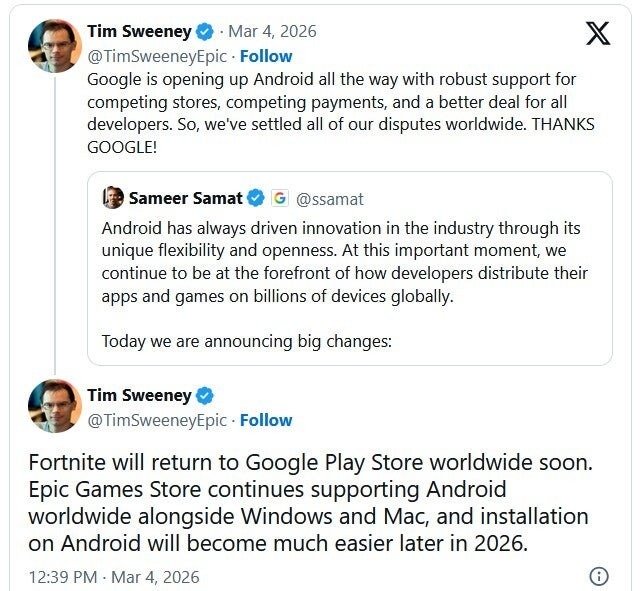 CEO-ul Epic Games, Tim Sweeney, a salutat decizia, afirmând că noile condiții reprezintă „o ofertă mai bună pentru toți dezvoltatorii”. Google spune că schimbările ar trebui să ducă la un ecosistem Android mai puternic și la aplicații de calitate mai mare pentru utilizatori.
