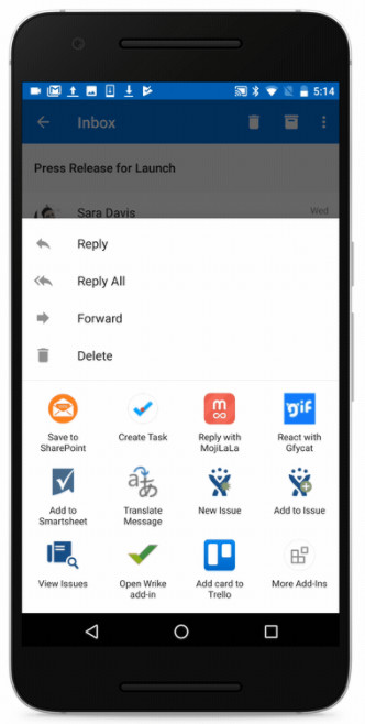 Add-ins debutau pe Outlook pentru iOS cu ceva vreme în urmă, iar acum e rândul lui Android. Cu ajutorul unui add-in veţi putea salva un mail într-o aplicaţie de management al task-urilor, traduce mail-uri din mers, adăuga note din Evernote şi nu va mai fi nevoie de copy/paste sau să ieşiţi şi intraţi în aplicaţie. Reţineţi că pentru a avea acces la această funcţie trebuie să aveţi un cont de email comercial Outlook.com şi Office 365.