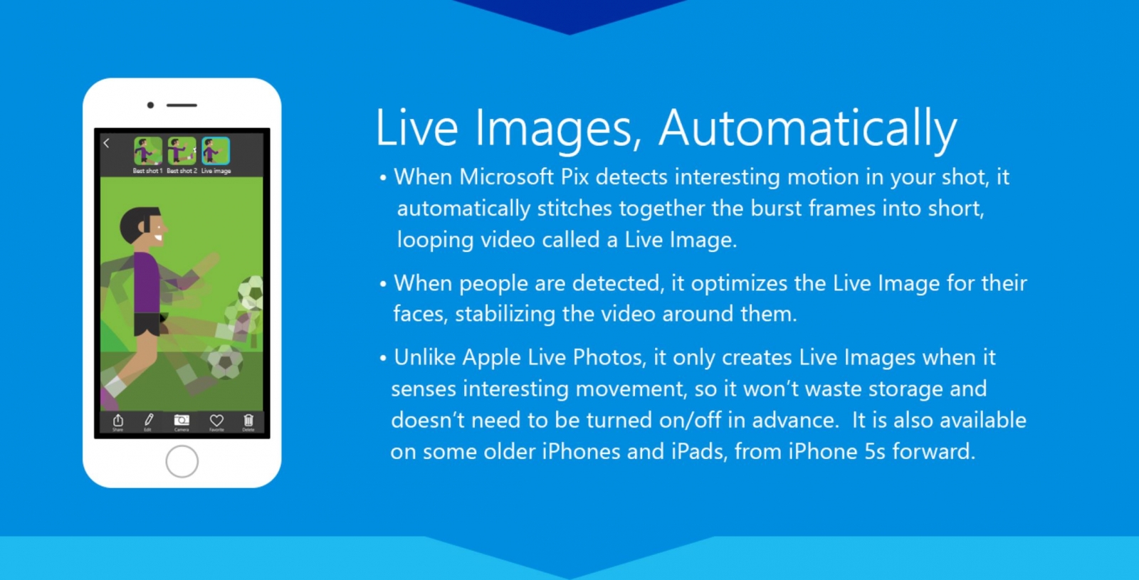 Această aplicație va realiza o serie de fotografii atât înaintea apăsării butonului de captură, dar și după, urmând ca mai apoi să ne ofere posibilitatea de a alege cele mai bune imagini. Expunerea și nivelul ISO vor fi ajustate automat, iar printre alte funcții avem și Automatic Live Image - modalitate prin care se va crea un scurt video. În cazul în care se detectează o față, Microsoft Pix va stabiliza automat cadrul.