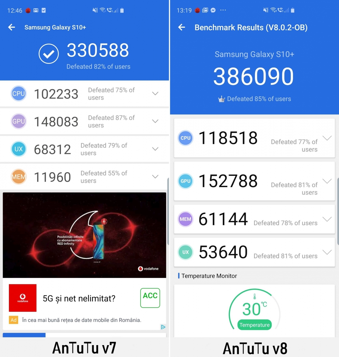 Schimbările de care vorbeam se reflectă și în testele pe care le-am realizat aici la Mobilissimo folosind un Samsung Galaxy S10+ și ultimele două versiuni de AnTuTu. Se remarcă o creștere semnificativă a punctajului obținut în cadrul AnTuTu v8 Beta, scorurile fiind în creștere la toate capitolele. Ce înseamna asta este că nu vom putea compara rezultatul unui telefon din AnTuTu v7 cu cel obținut în AnTuTu v8 tocmai datorită modificărilor și optimizărilor făcute.