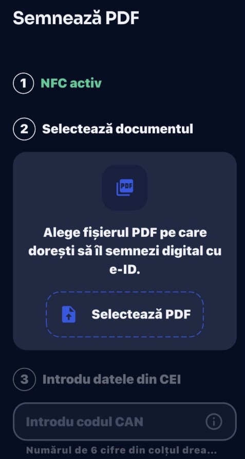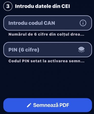 Următorul pas este introducerea PIN-ului de șase cifre asociat cărții de identitate electronice, care confirmă autorizarea semnăturii. În final, utilizatorul trebuie doar să apropie cartea de identitate de telefonul compatibil NFC, iar documentul este semnat digital folosind certificatul și funcțiile criptografice integrate în cipul documentului.