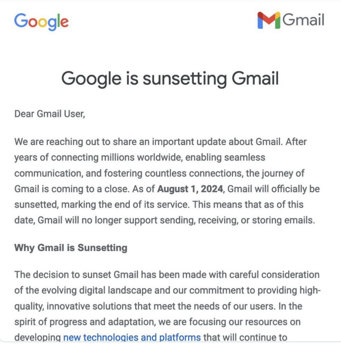 Utilizatorul X @growing_daniel a propagat un mesaj ce părea să vină de la Google şi să spună că Gmail se închide pe 1 august 2024. Google are un istoric îndelungat de aplicaţii apreciate, dar "ucise" şi există şi un site killedbygoogle.com, care are produsele respective listate. Sunt peste 290!