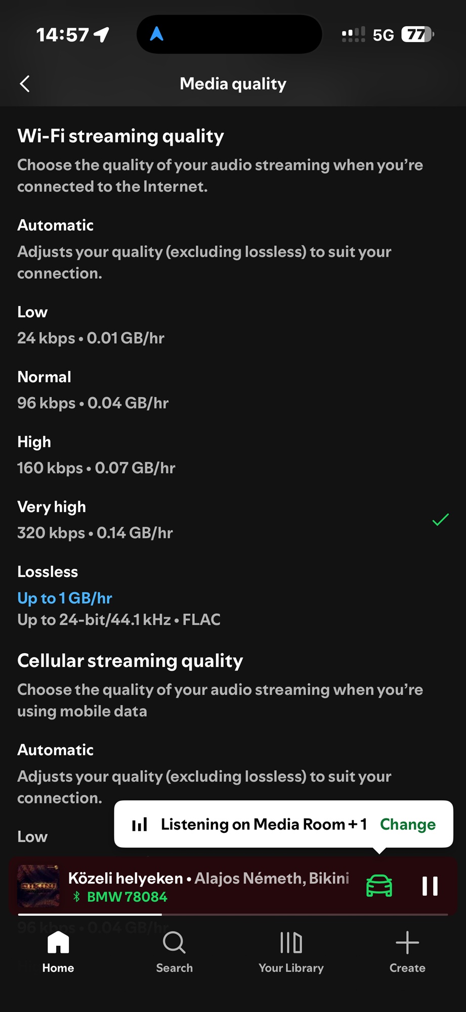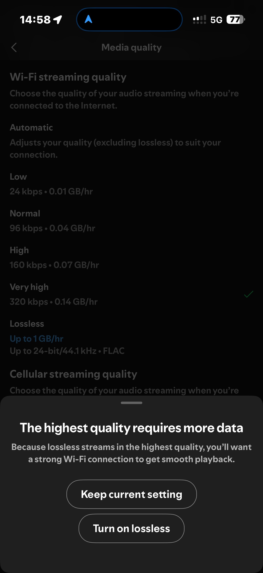 Spotify mai spune că ar fi nevoie de o rețea Wi-Fi stabilă. Există însă această limitare hardware de care trebuie să ții cont dacă vrei să asculți la calitate înaltă piesele preferate. Toate melodiile par să fie disponibile în noul format, dar nu sunt marcate distinct în aplicație. Singurul indiciu vizibil este textul „Lossless” scris cu verde, în interfața de redare.