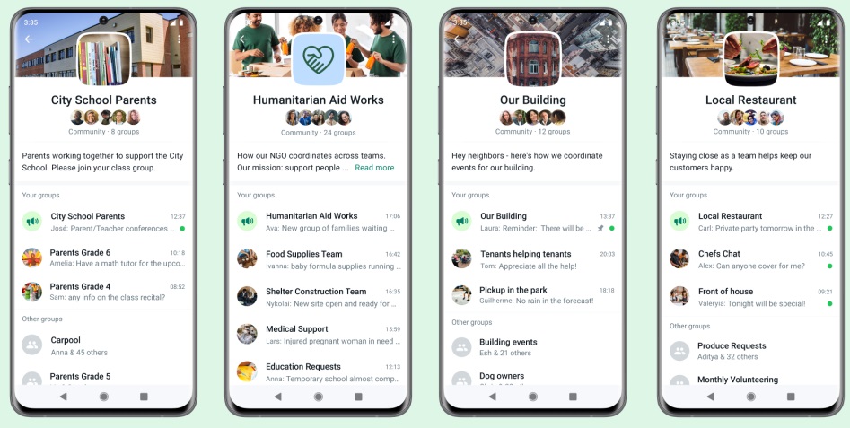 Această este practic o colecție de grupuri și aflăm că utilizatorii pot crea o astfel de Comunitate prin adăugarea de grupuri care au un topic similar. Vor exista admini care administrează grupurile din Comunitate, persoane care vor putea trimite mesaje către toate grupurile în același timp - o modalitate prin care conversațiile individuale legate de acel grup pot continua dar și primi anunțuri din partea adminului care au impact asupra tuturor grupurilor din Comunitate.