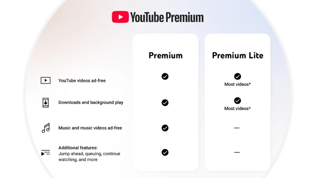 Lansat anul trecut ca alternativă mai accesibilă la Premium, pachetul Lite începe să capete sens pentru cei care vor mai puține reclame, dar nu au nevoie de toate beneficiile. Platforma încearcă acum să echilibreze diferența dintre varianta „standard” Premium și cea redusă, fără să canibalizeze complet abonamentului mai scump. Față de Premium, varianta Lite nu include acces la platforma YouTube Music, iar clipurile cu specific muzical au parte de reclame. Apar reclame și cazul altor clipuri, dar mai scurte ca durată.
