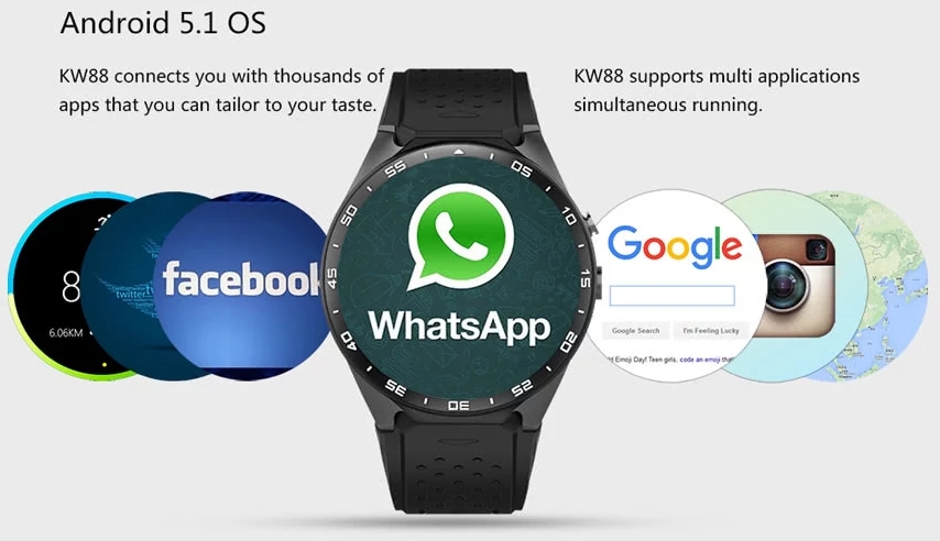 Kingwear KW88 3G ne mai pune la dispoziție și o cameră foto de 2 megapixeli, nelipsitul senzor de puls pentru monitorizarea numărului de pași și a caloriilor arse, dar și un senzor pentru măsurarea ritmului cardiac. Este compatibil cu telefoane Android sau iOS, dar poate fi utilizat și de sine stătător grație suportului 3G pentru microSIM.
