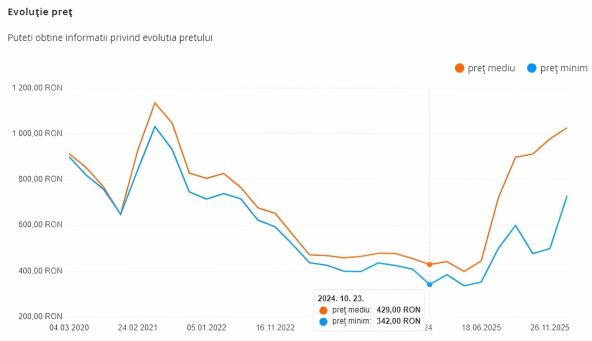 Ca exemplu, memoria VENGEANCE RGB PRO 32GB (DDR4) de la Corsair, s-a vândut în luna octombrie cu 342 lei. La câteva zile distanță prețul kit-ului a crescut brusc, ajungând undeva la 899 de lei dacă privim spre oferta PC Garage. Am folosit Compari.ro pentru graficul explicativ.