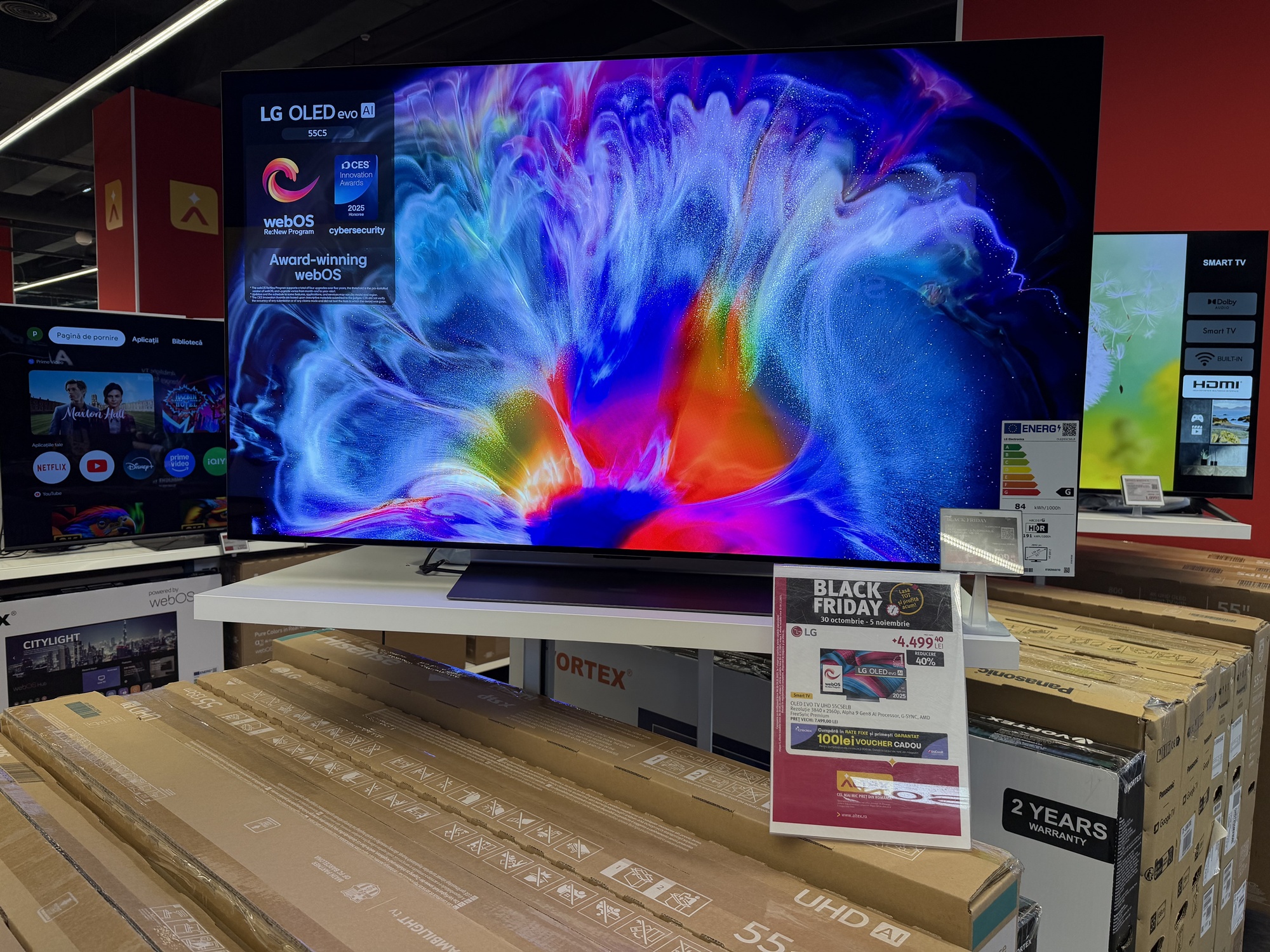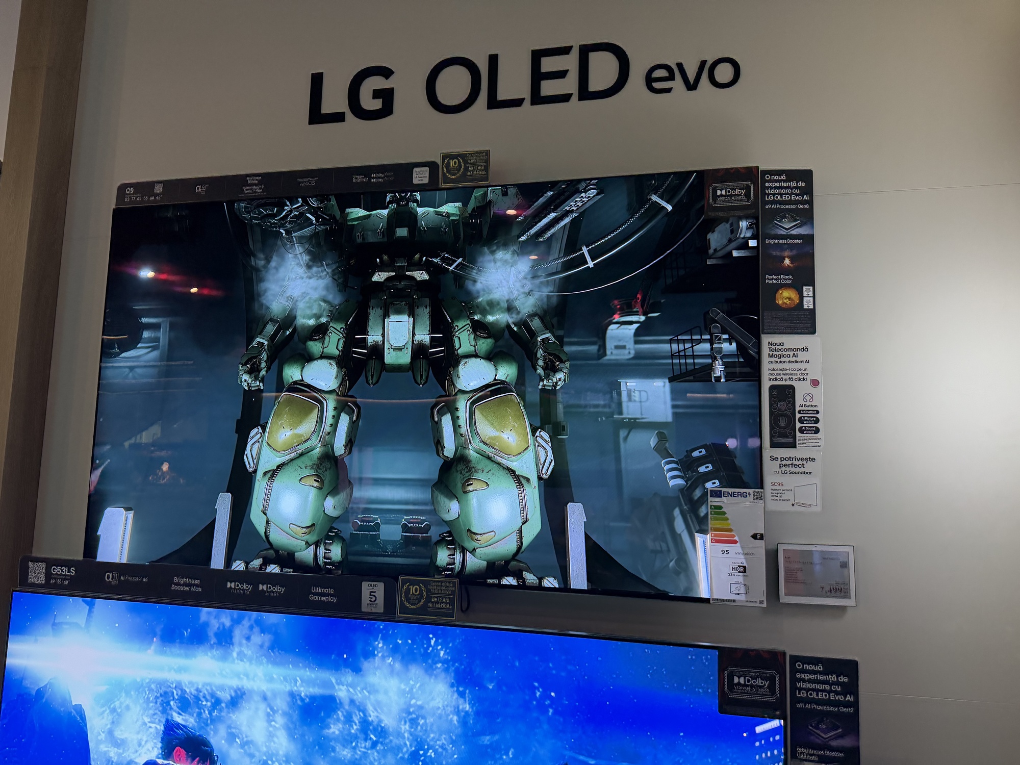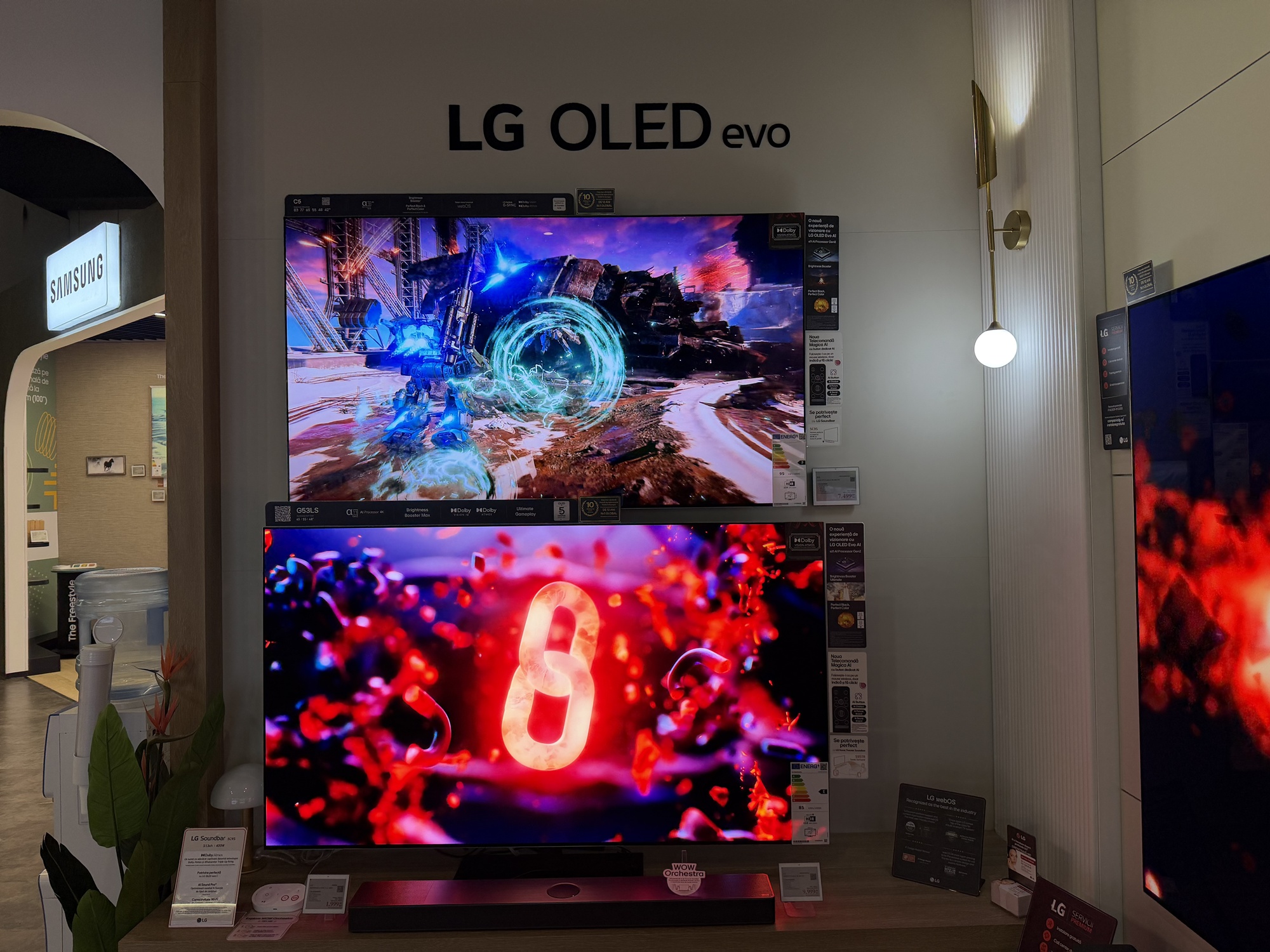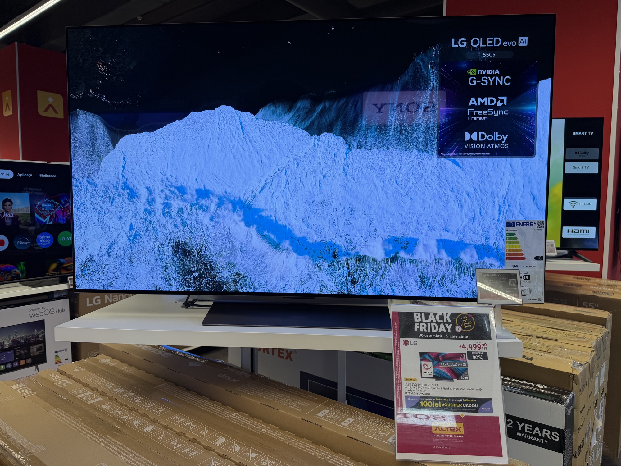 În primul rând acest TV are reduceri în două variante: cea de 55 inch, adică 139 cm, de la 7499 la 4499 lei şi cea de aproape 2 metri, mai precis 77 inch sau 195 cm. Ea ajunge de la 11.399 lei la 7979 lei. E un TV imens, cu panou OLED 4K, cu Dolby Atmos şi Dolby Vision, cu 144 Hz refresh rate pentru gamerii competitivi.