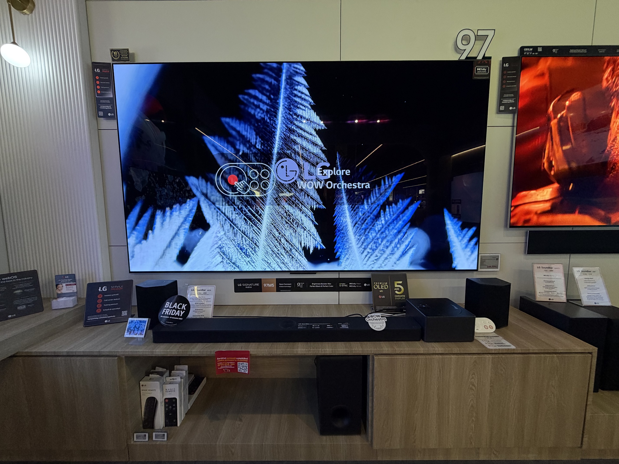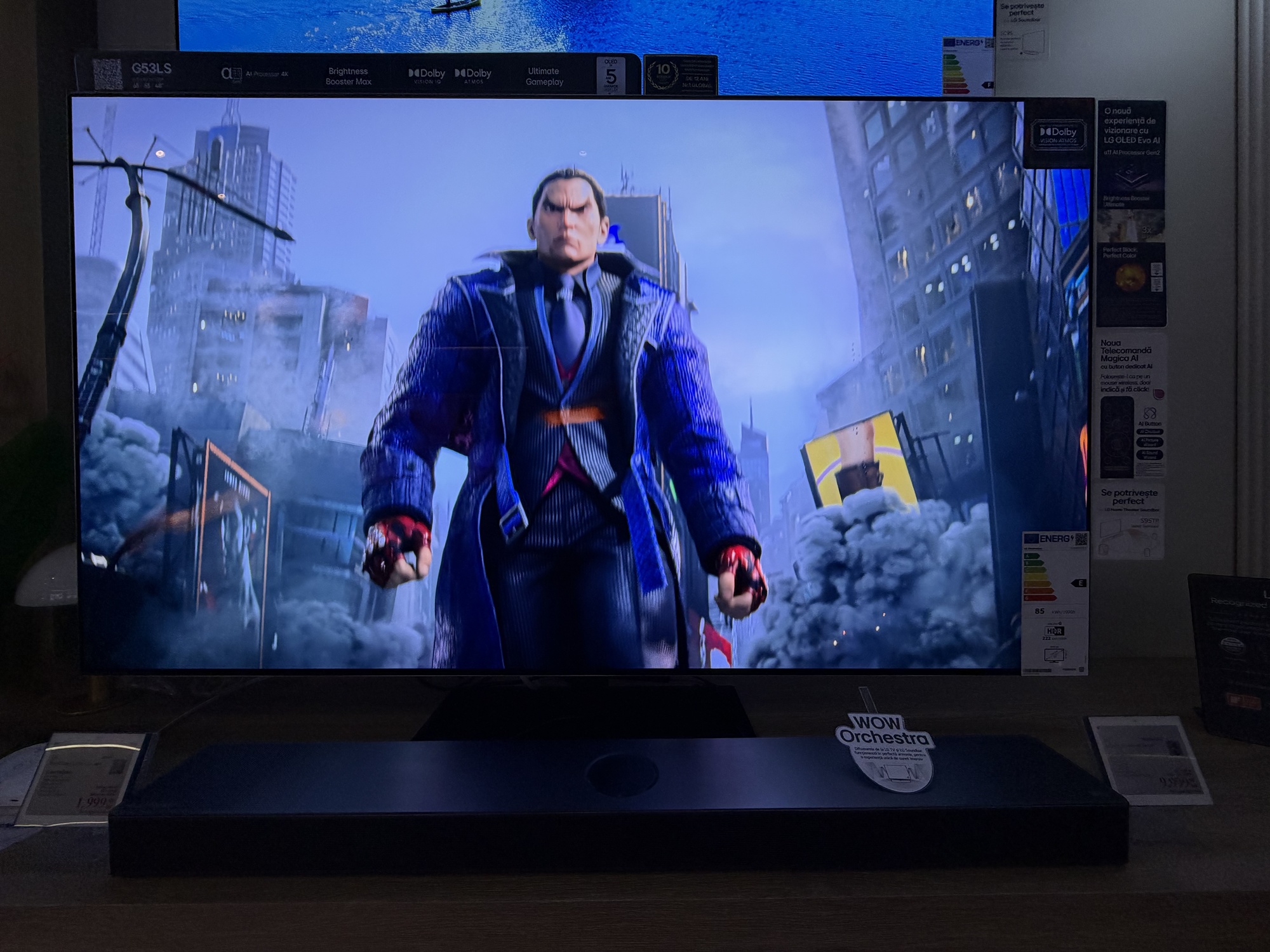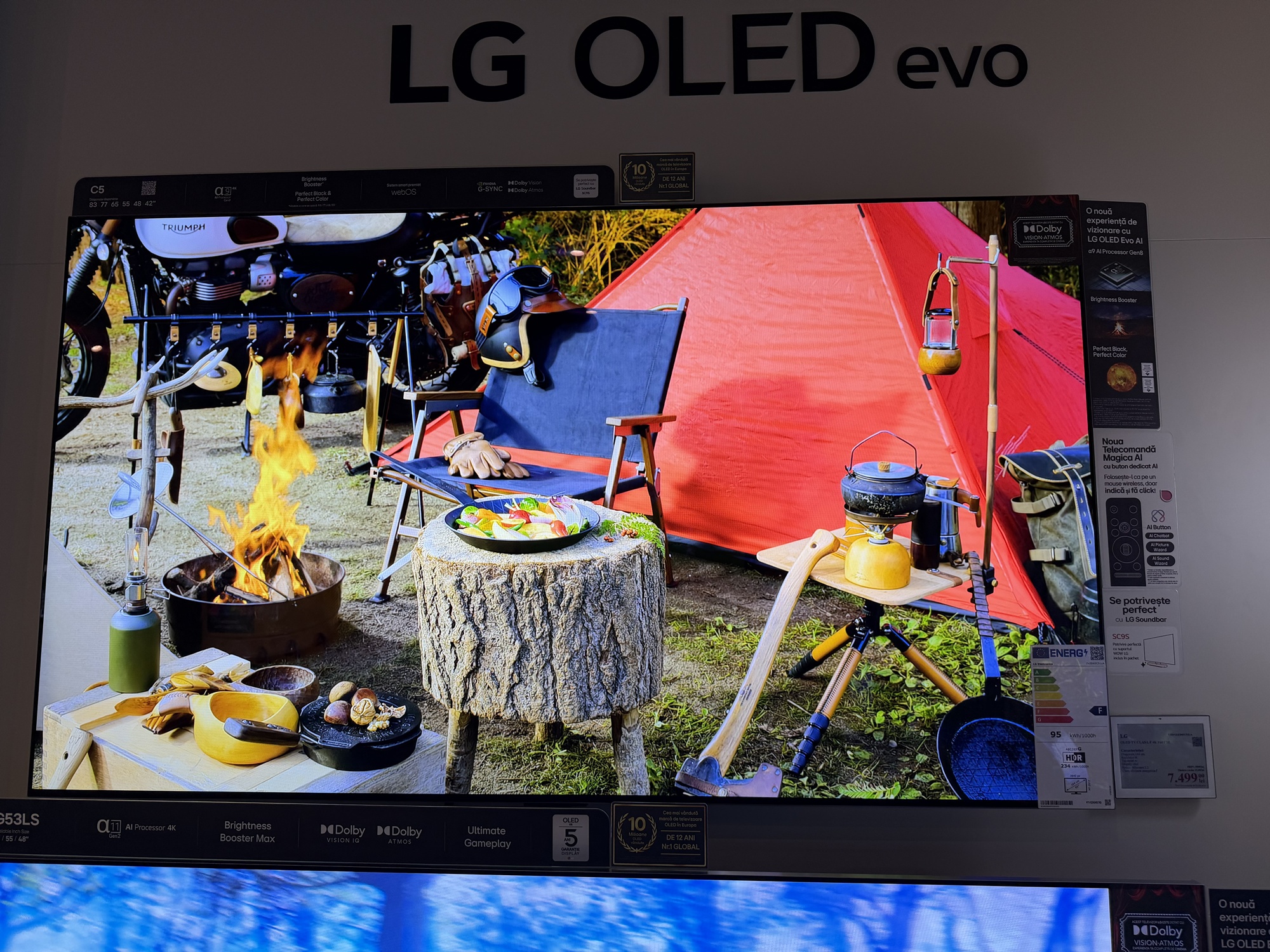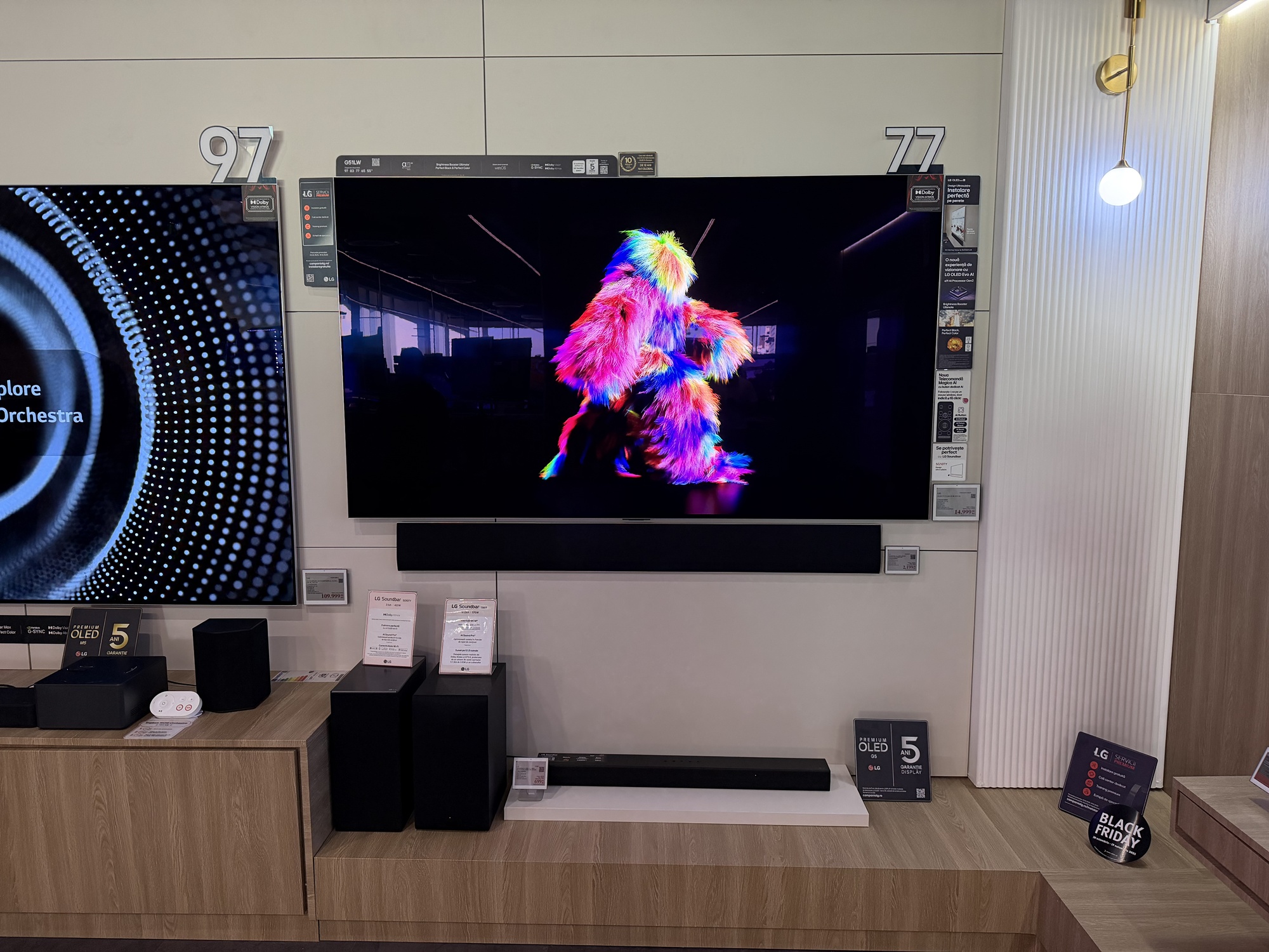 În primul rând acest TV are reduceri în două variante: cea de 55 inch, adică 139 cm, de la 7499 la 4499 lei şi cea de aproape 2 metri, mai precis 77 inch sau 195 cm. Ea ajunge de la 11.399 lei la 7979 lei. E un TV imens, cu panou OLED 4K, cu Dolby Atmos şi Dolby Vision, cu 144 Hz refresh rate pentru gamerii competitivi.