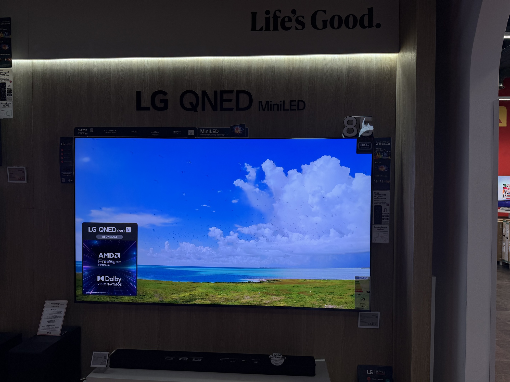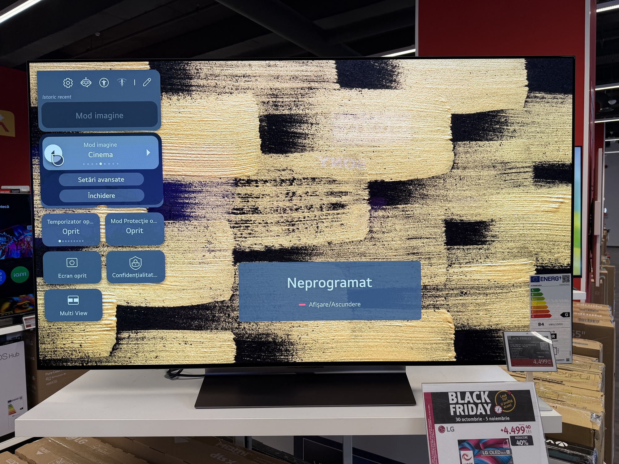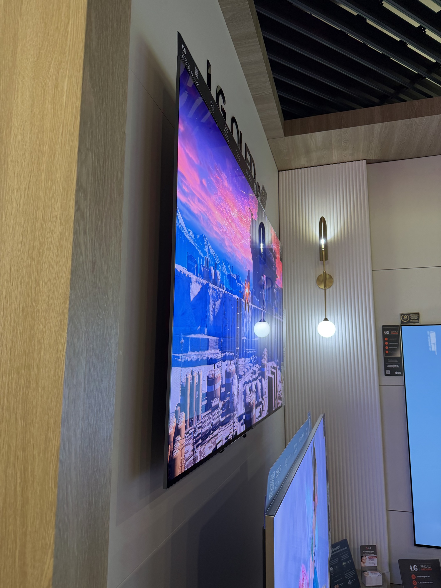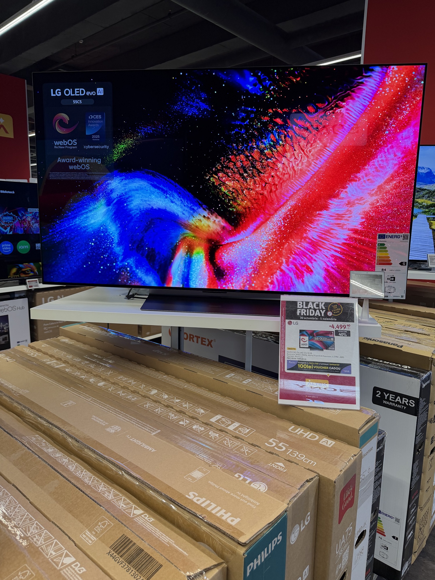 În primul rând acest TV are reduceri în două variante: cea de 55 inch, adică 139 cm, de la 7499 la 4499 lei şi cea de aproape 2 metri, mai precis 77 inch sau 195 cm. Ea ajunge de la 11.399 lei la 7979 lei. E un TV imens, cu panou OLED 4K, cu Dolby Atmos şi Dolby Vision, cu 144 Hz refresh rate pentru gamerii competitivi.