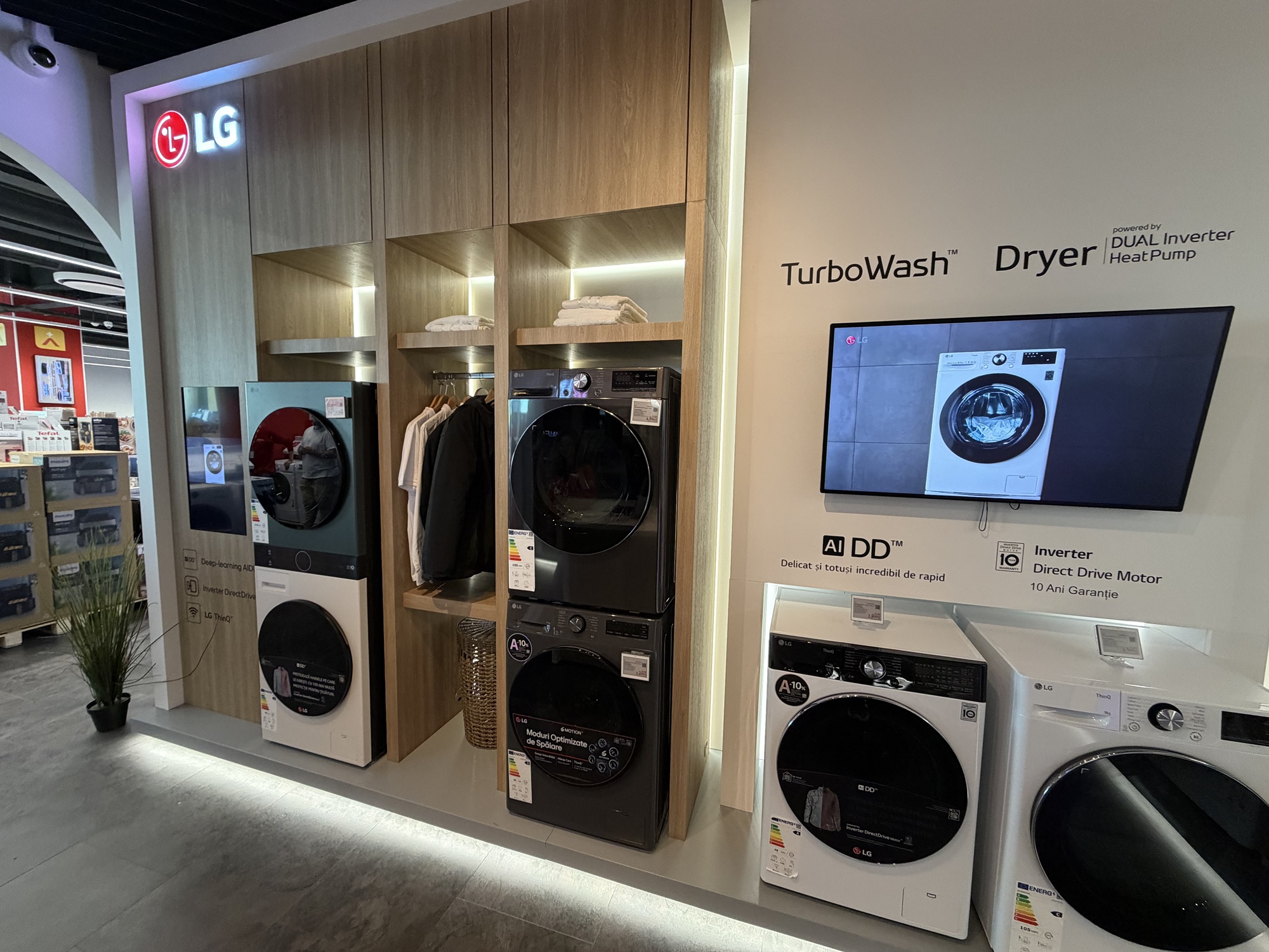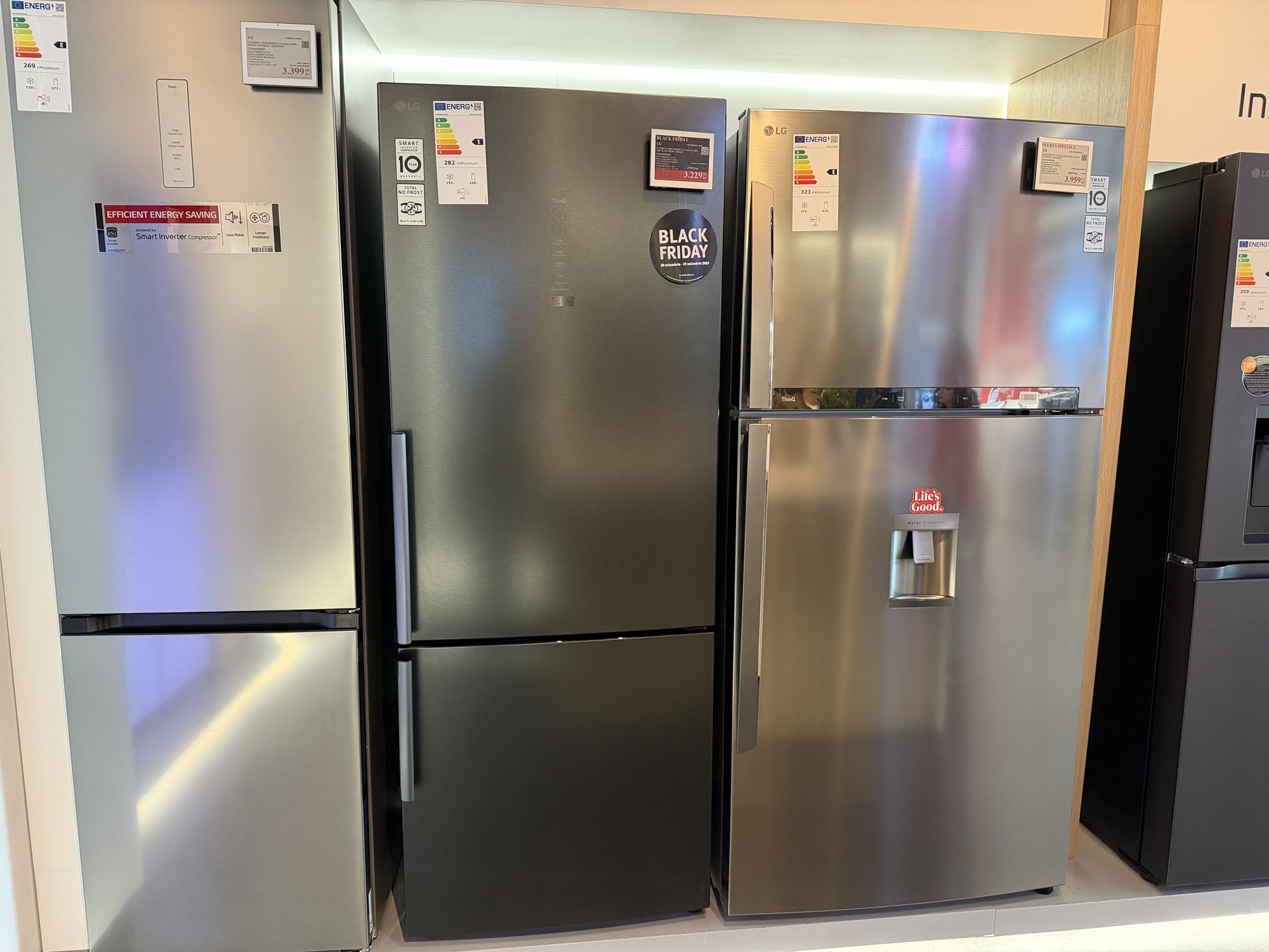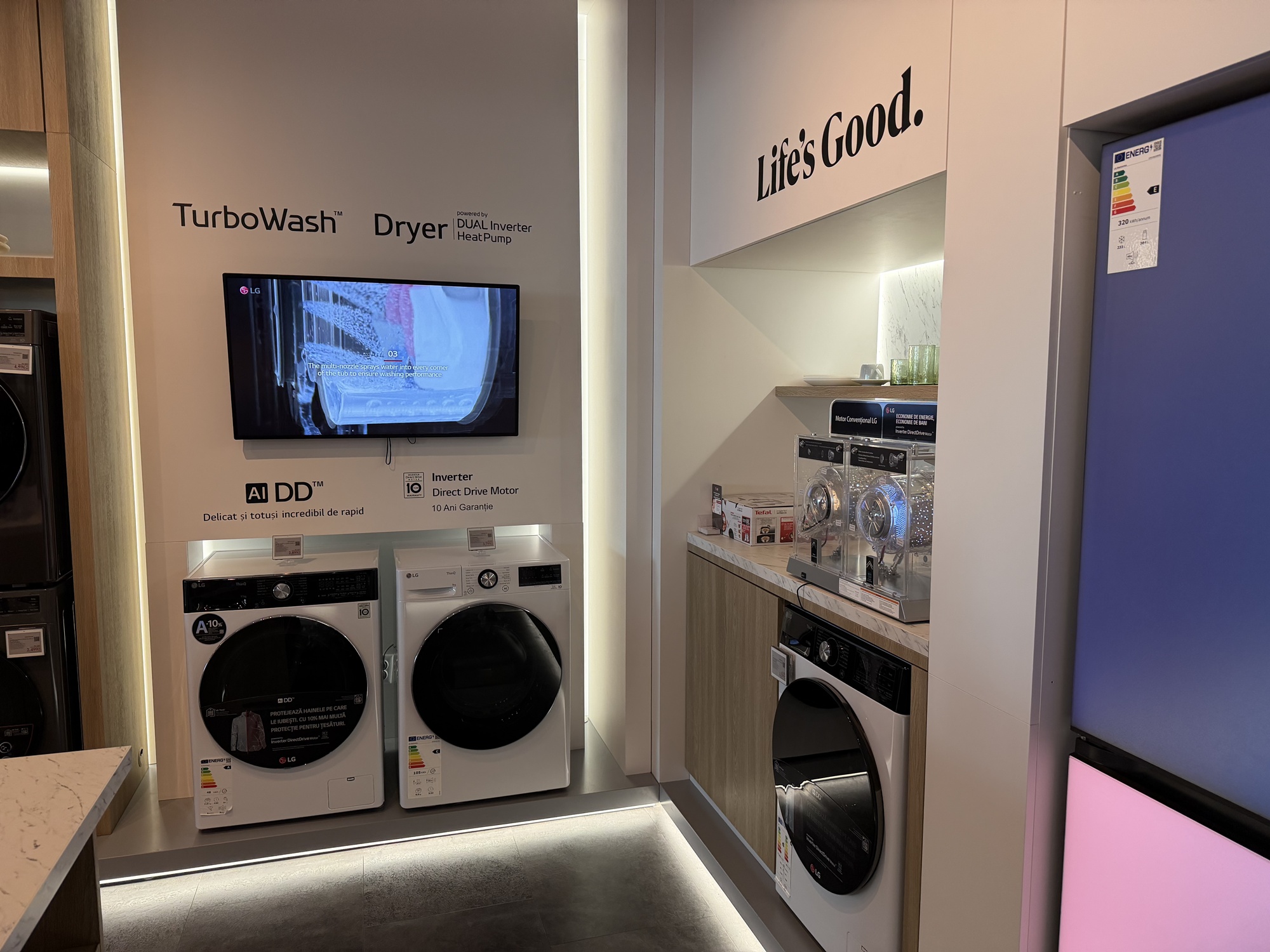 Am mai văzut şi un frigider cu rafturi telescopice, cu ventilaţie rece pentru răcirea uşii mai rapidă, dar şi două modele pe care le poţi programa când eşti la birou, să răcească rapid preparatele pentru când vin musafirii. Atenţie şi la cei 10 ani garanţie compresor pentru frigider şi invetor pentru maşina de spălat.