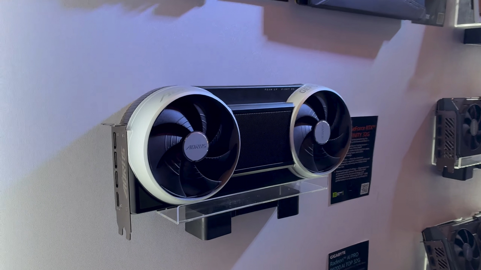 Preferata mea de la stand totuşi a fost placă Aorus GeForce RTX 5090 Infinity 32 GB, cu doar două ventilatoare, dar unele cu putere foarte mare şi inspirate din avioanele cu reacţie (că design). Avem parte de tehnologie Windforce Hyperburst, cu ventilatoare brevetate Hawk. Plus vapor chamber, heatpipe-uri şi design cu flux dual de aer.
