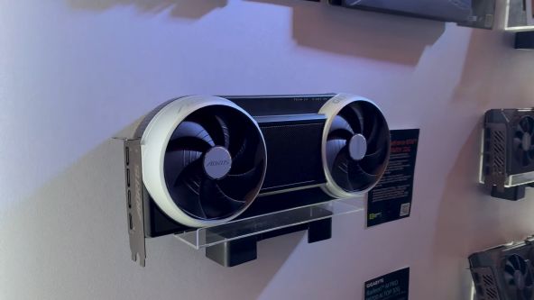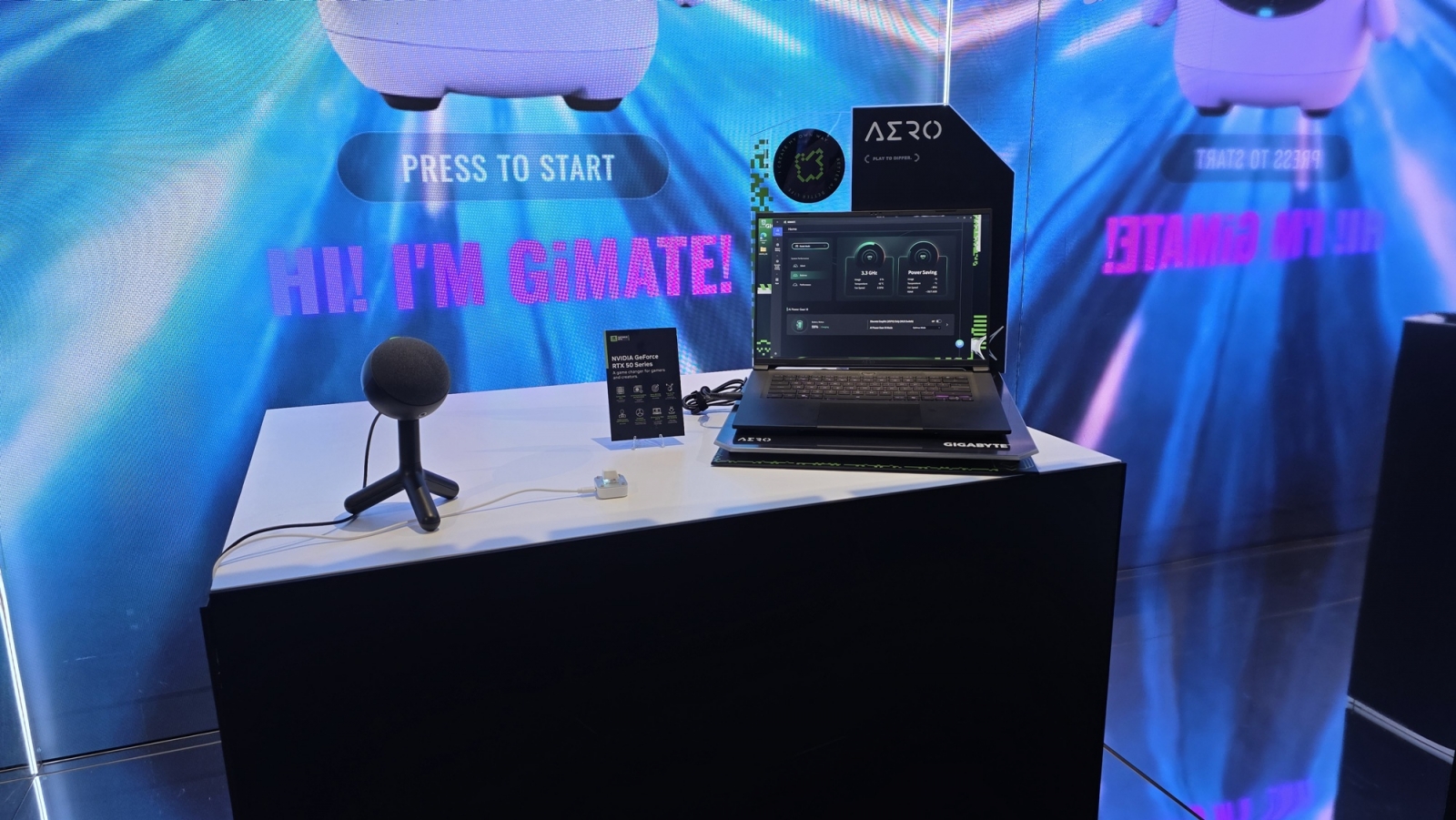 Începem periplul cu GiMate, un AI pe care îl declanşezi cu o apăsare de buton şi comandă vocală. GiMate poate umbla la volum, luminozitate, alocare de resurse, RAM, CPU, GPU. Am văzut şi nişte laptopuri Gigabyte cu nouă răcire Windforce Infinity EX şi placi grafice RTX 5000.