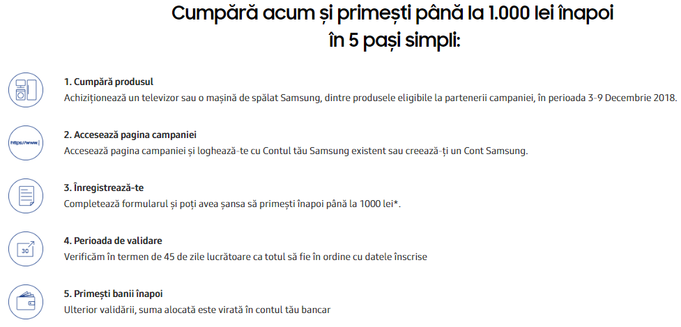 După ce luna trecută Samsung România venea cu o promoție specială prin care cumpărătorii de Galaxy S9, S9+ și Note 9 puteau primi 450 lei înapoi din suma cheltuită pe device (articol aici), iată că acum la început de decembrie avem parte de o promoție similară organizată de această dată în zona de electrocasnice.