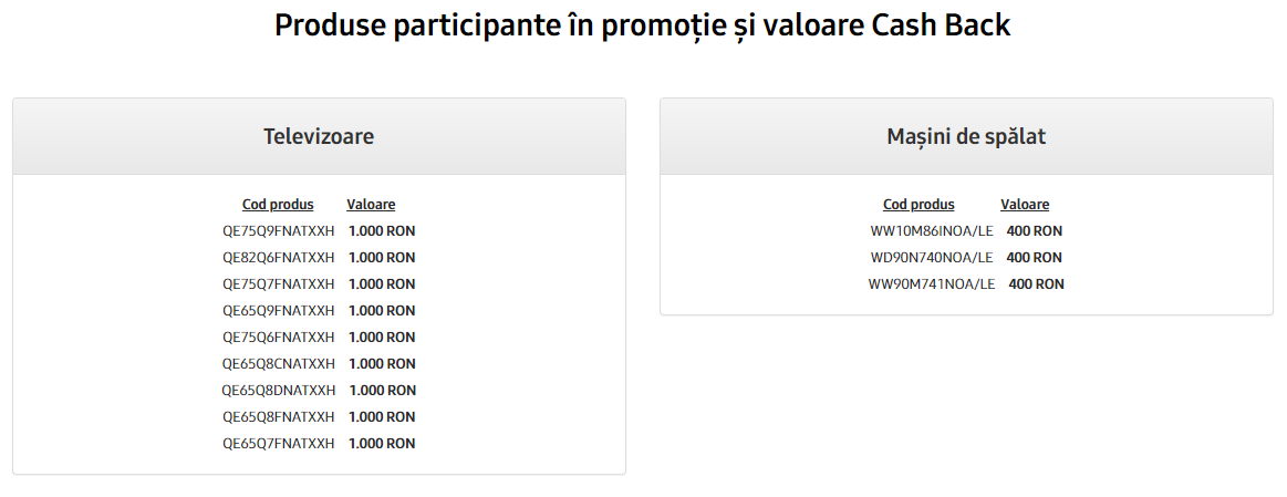 Aflați că 80 cash back-uri vor fi alocate achizițiilor de televizoare participante în campanie, respectiv 30 de cash back-uri acordate produselor electrocasnice participante în campanie. Mai sus aveți numele produselor participante și totodată valoarea în bani pe care o puteți primi înapoi dacă vă înscrieți în timp prin formularul de concurs.