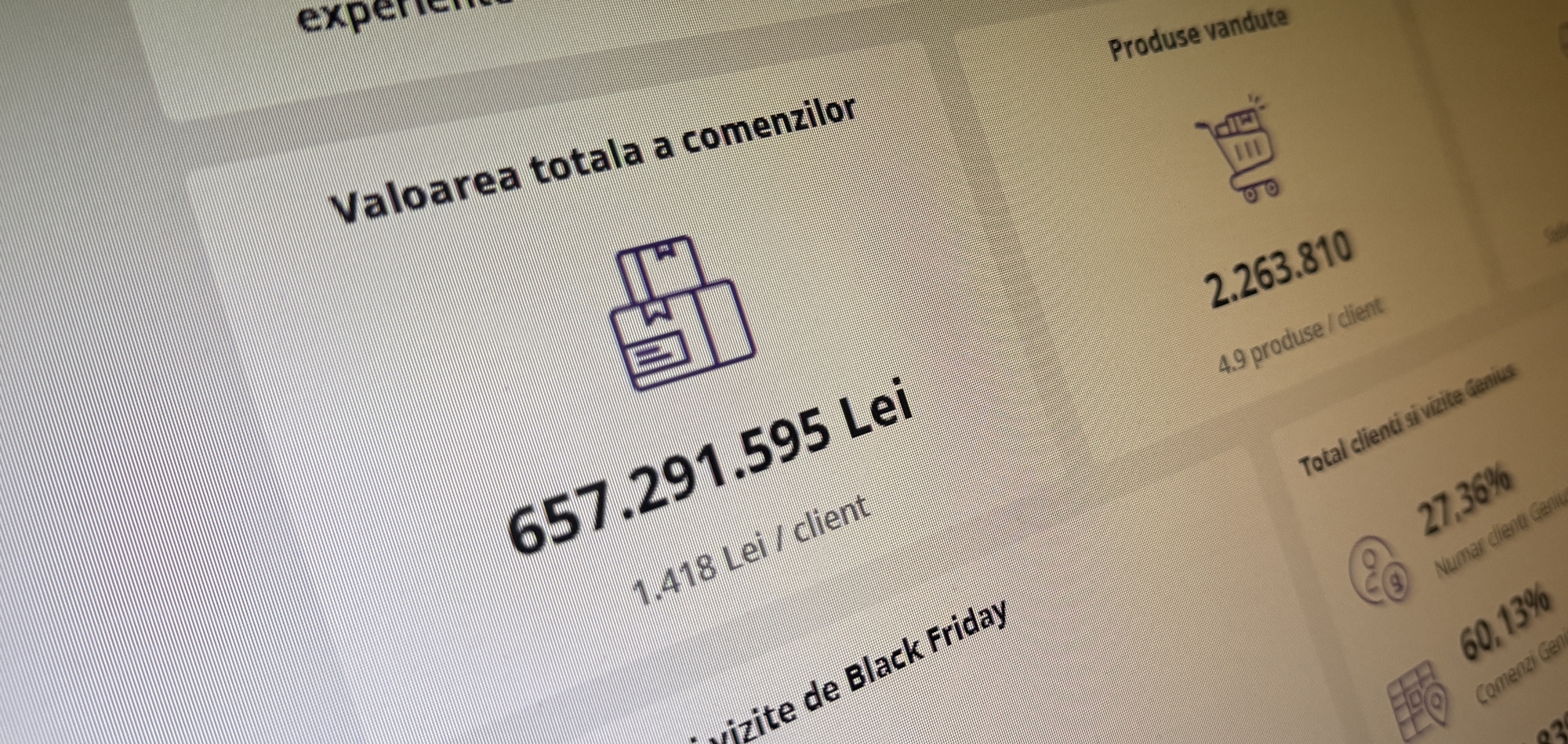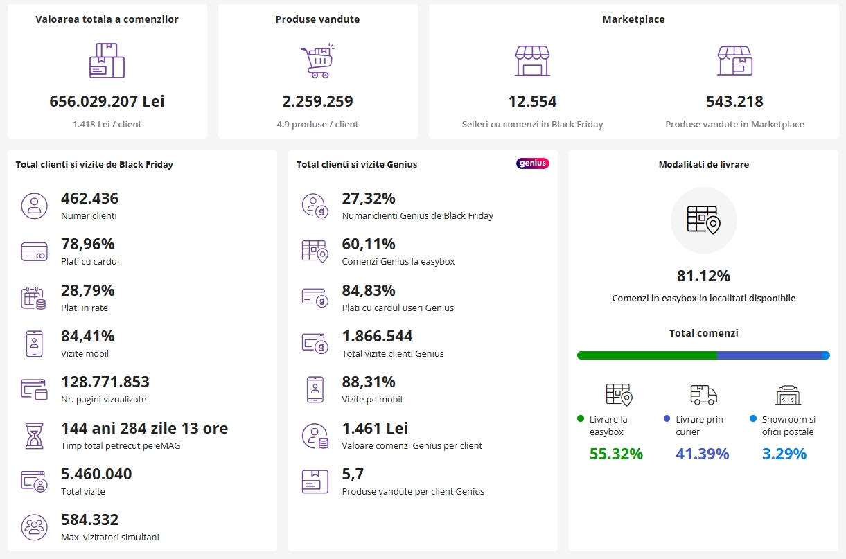 Văd că media de produse per client este de 4.9 și că în medie un client a cheltuit 1418 lei. Au fost până la această oră peste 460.000 de clienți care au comandat și au ales în procent de 78,96% plata folosind cardul. De asemenea, 84,41% dintre vizite au venit de pe mobil și au fost vizualizate 128 milioane de pagini.