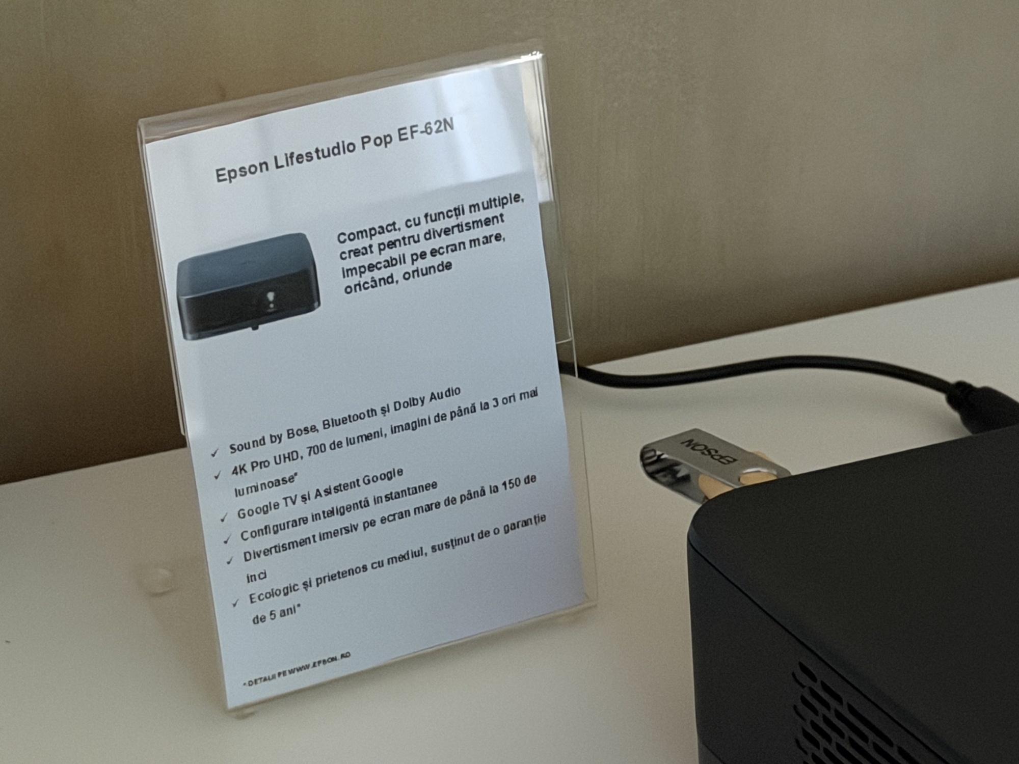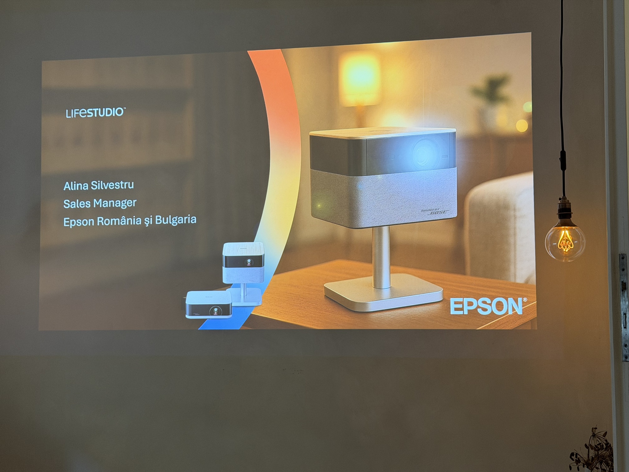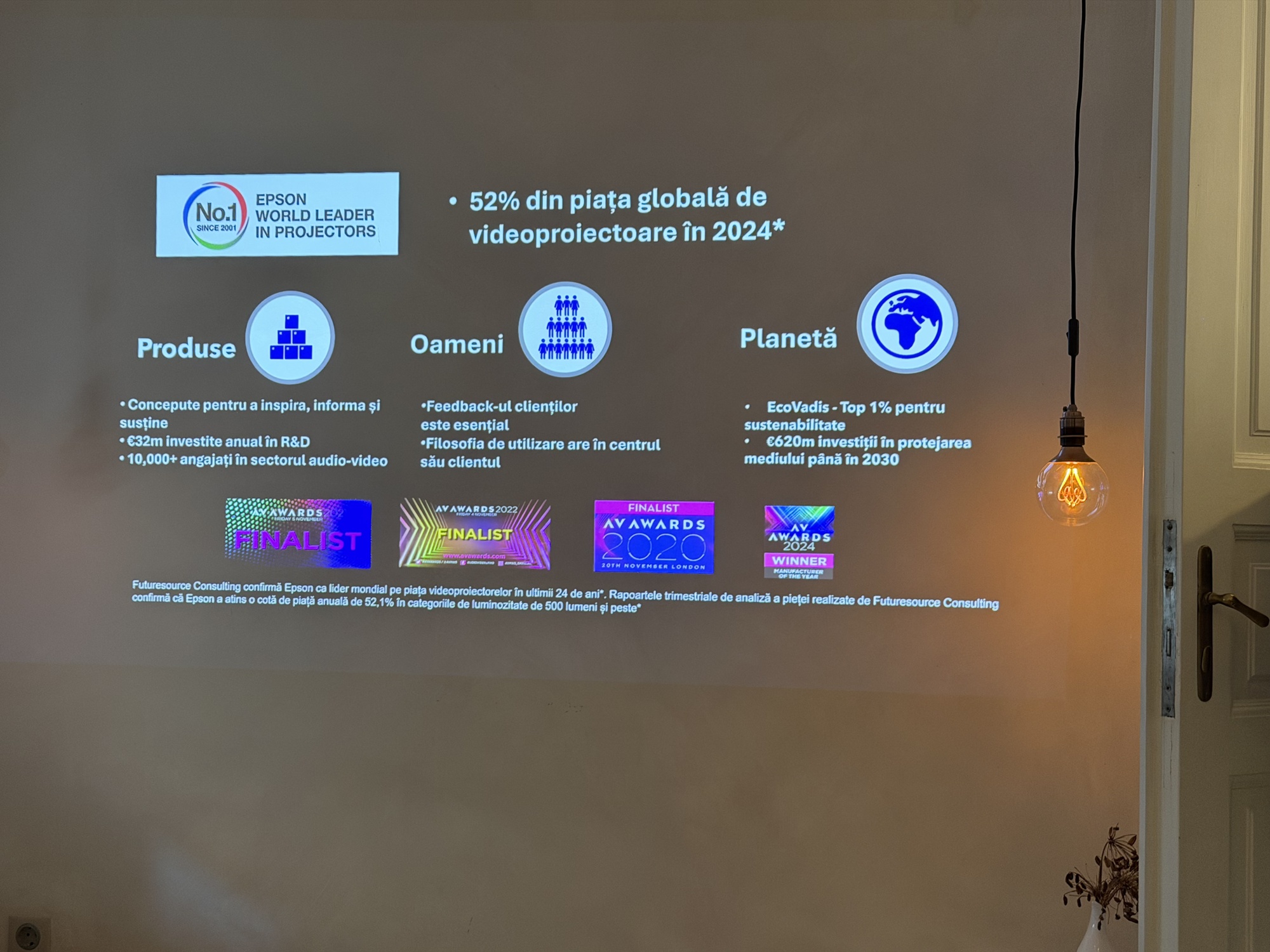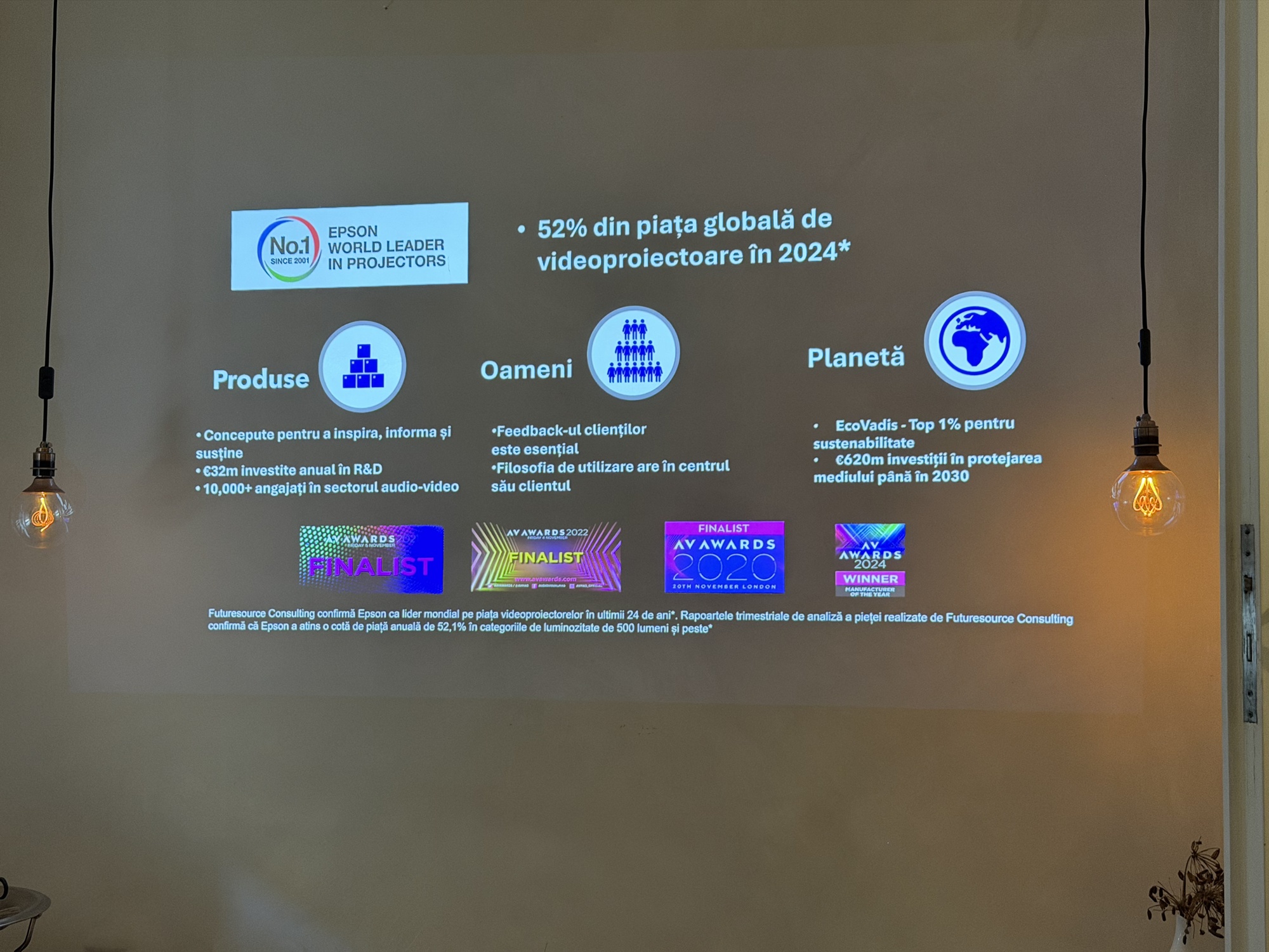Ne-a vorbit Alina Silvestru, Sales Manager Epson România şi Bulgaria. Cu această ocazie am aflat că Epson a avut în 2024 52% în piaţa globală de videoproiectoare, iar în România a ocupat locul întâi în această zonă. E locul întâi şi în segmentele Home Cinema şi Educaţie, dar şi Corporate. Prima jumătate din 2025 le-a adus o creştere şi o cotă de piaţă de 49% între videoproiectoarele de la noi.