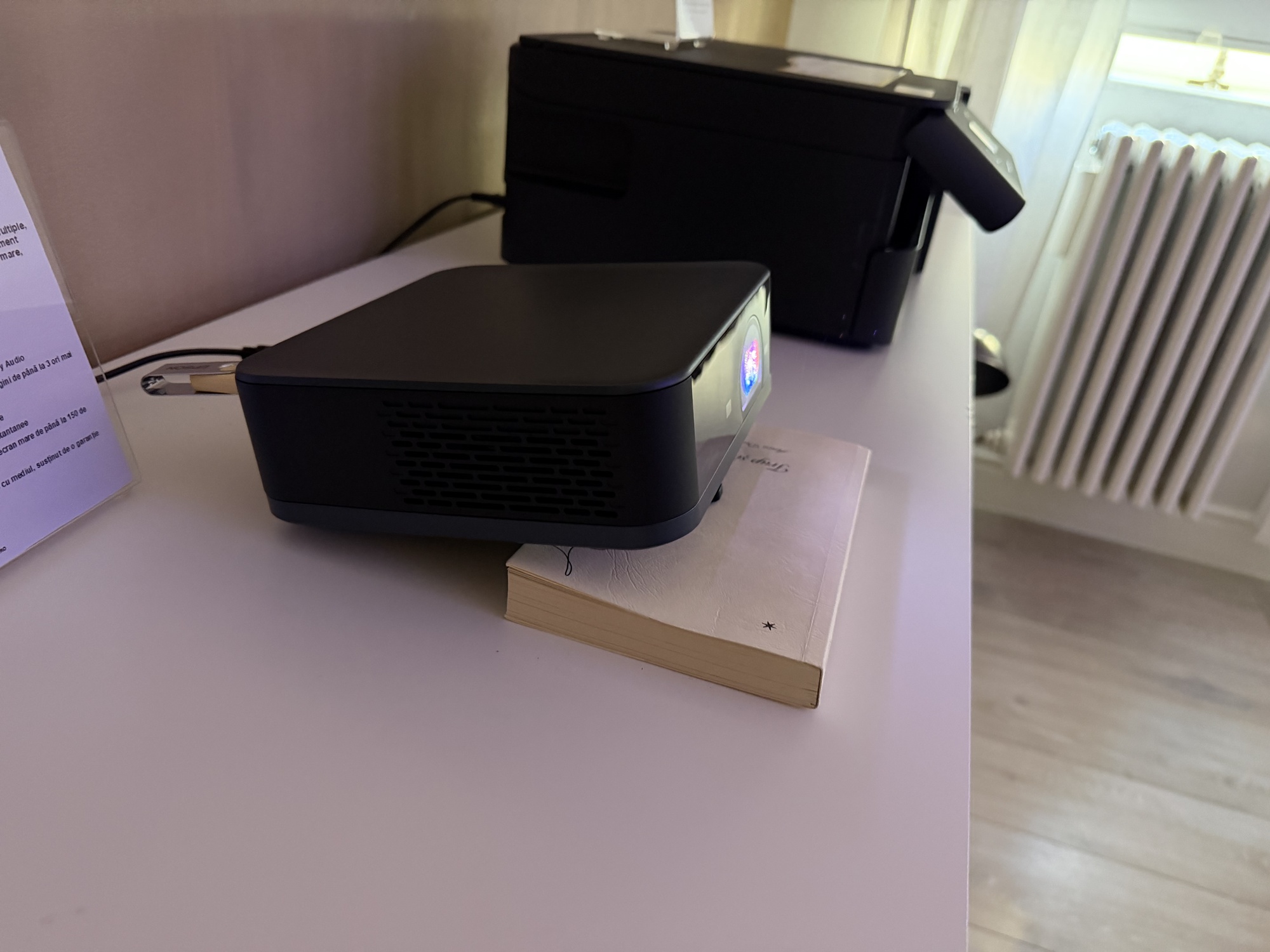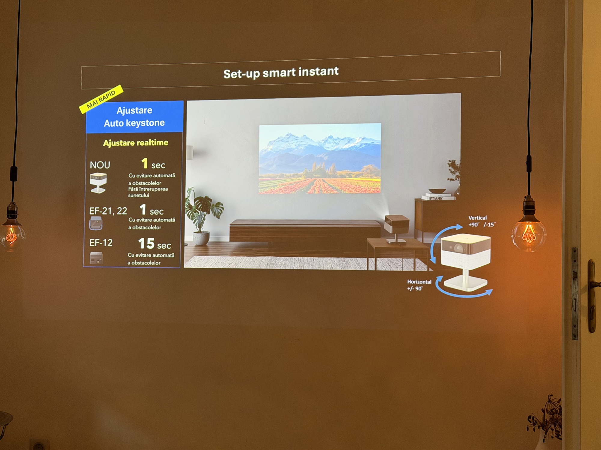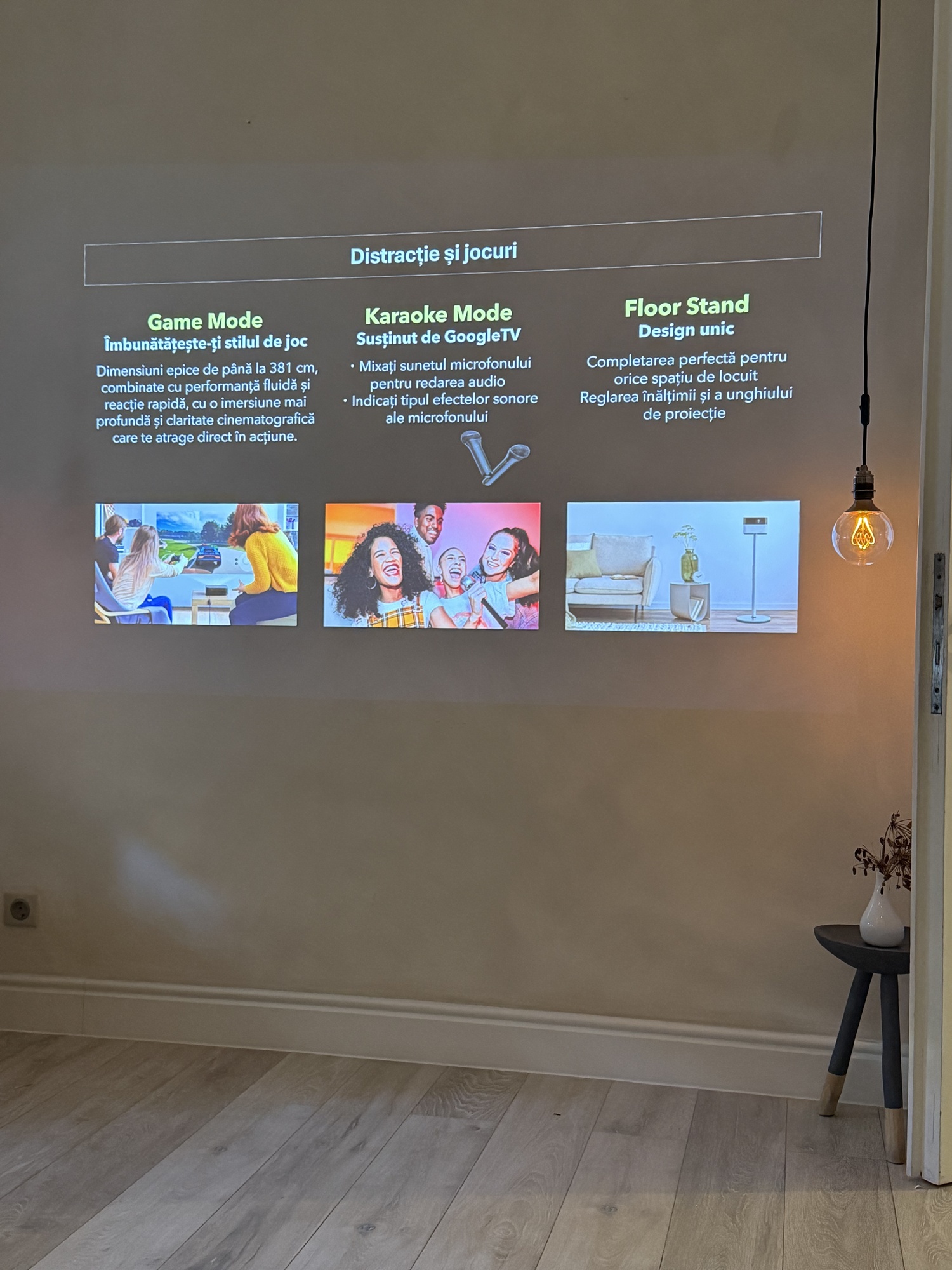 Diagonalele ajung la 381 cm şi avem un setup instant. Poţi folosi proiectorul şi că lampa şi chiar că boxa, dacă vrei alte utilizări. Ai şi mod Karaoke, Game Mode şi chiar funcţie de lampa pe suport înalt.