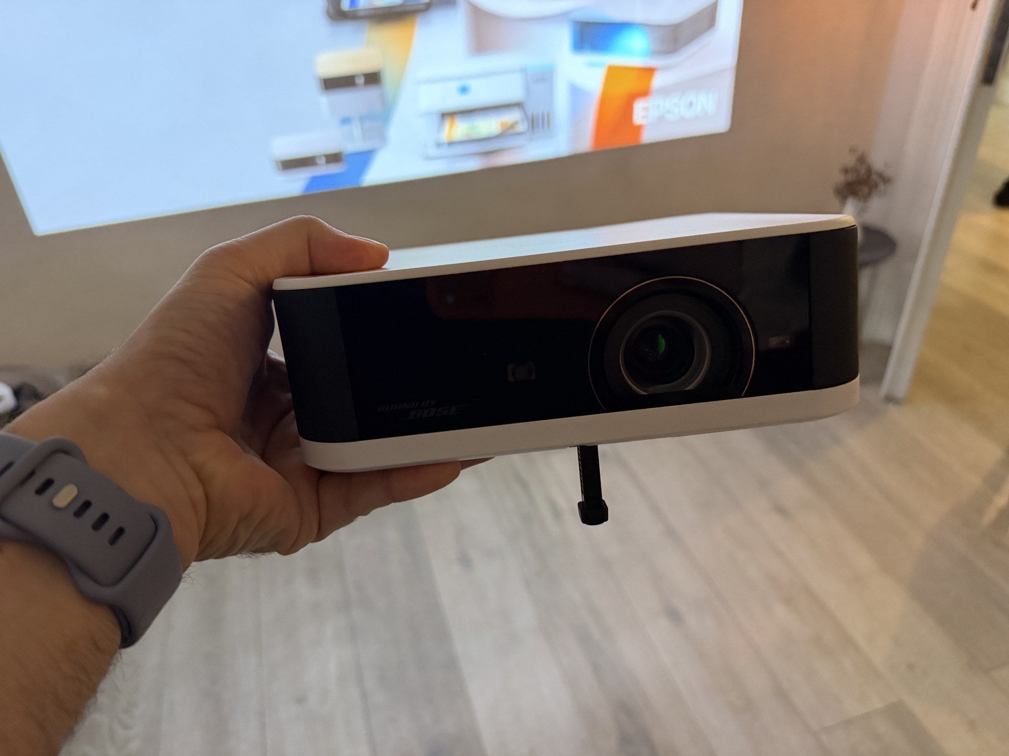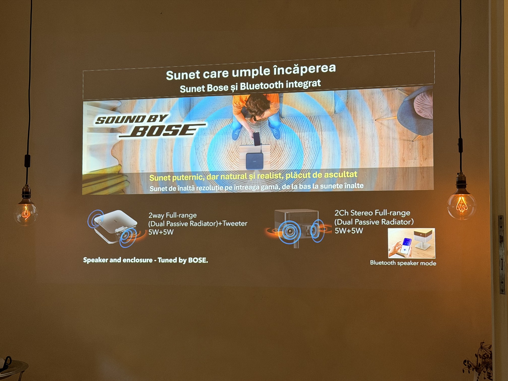 Toate noile modele se bucura de boxe Bose de 10W şi cele mai bine dotate au parte de gaming la 240 Hz în rezoluţie HD. De altfel am conectat un PS5 şi am jucat un Ghost of Tsushima scurt. Pe un model Pop, vreau să precizez. El poate fi scos şi afară, are protecţie anti praf şi până la 1000 de lumens. Îşi reglează automat aspectul imaginii, fără să umbli la el.