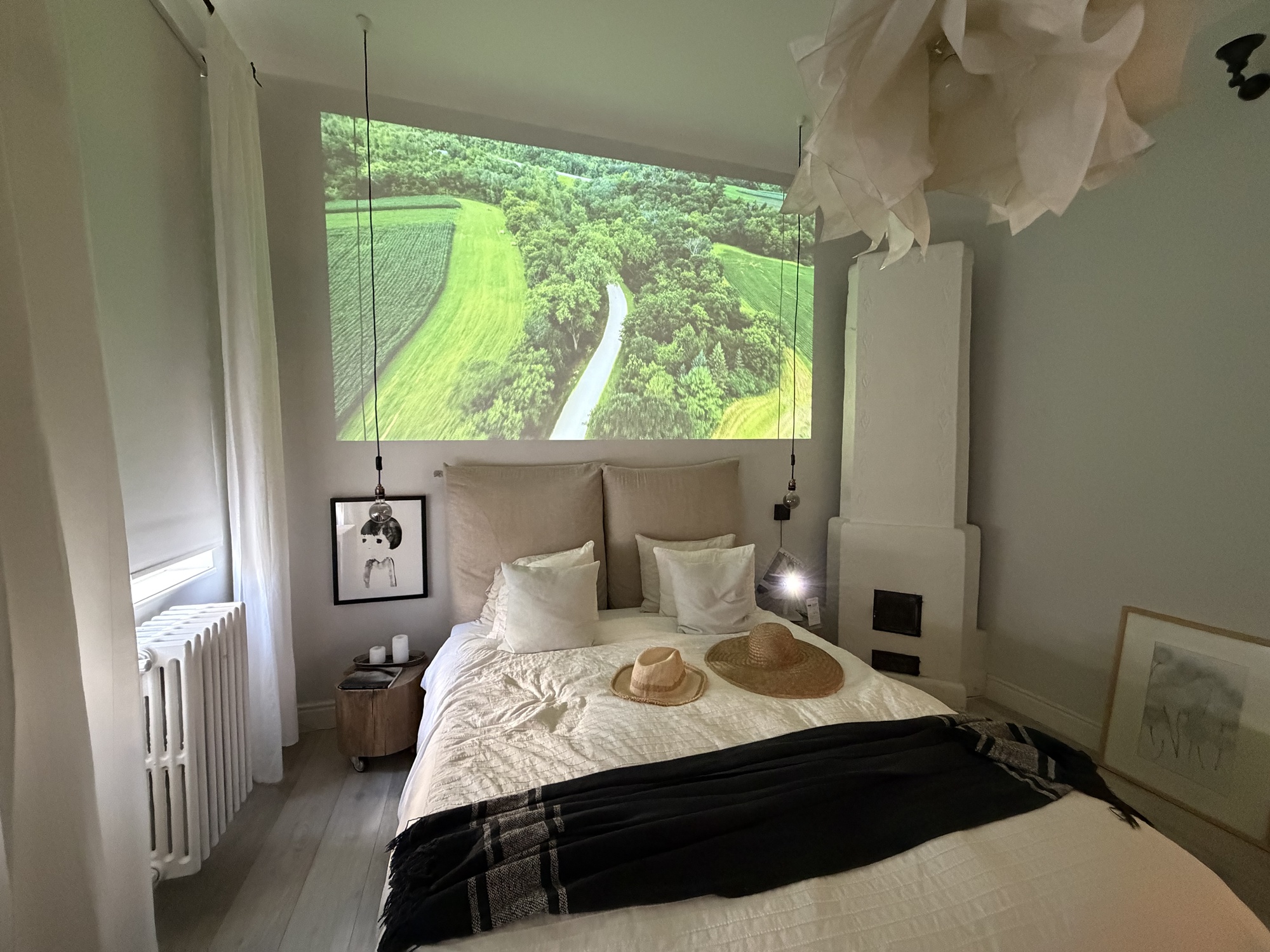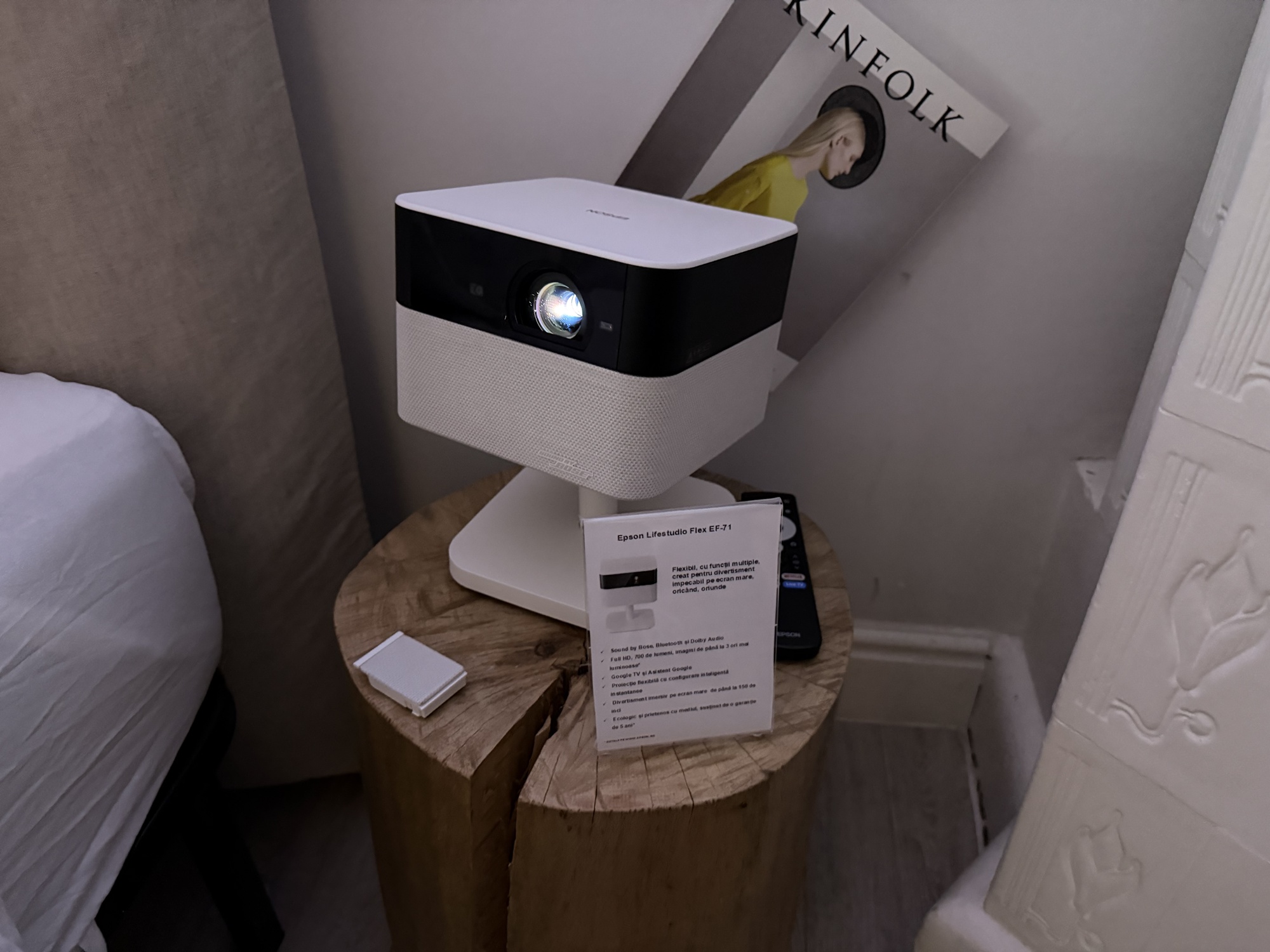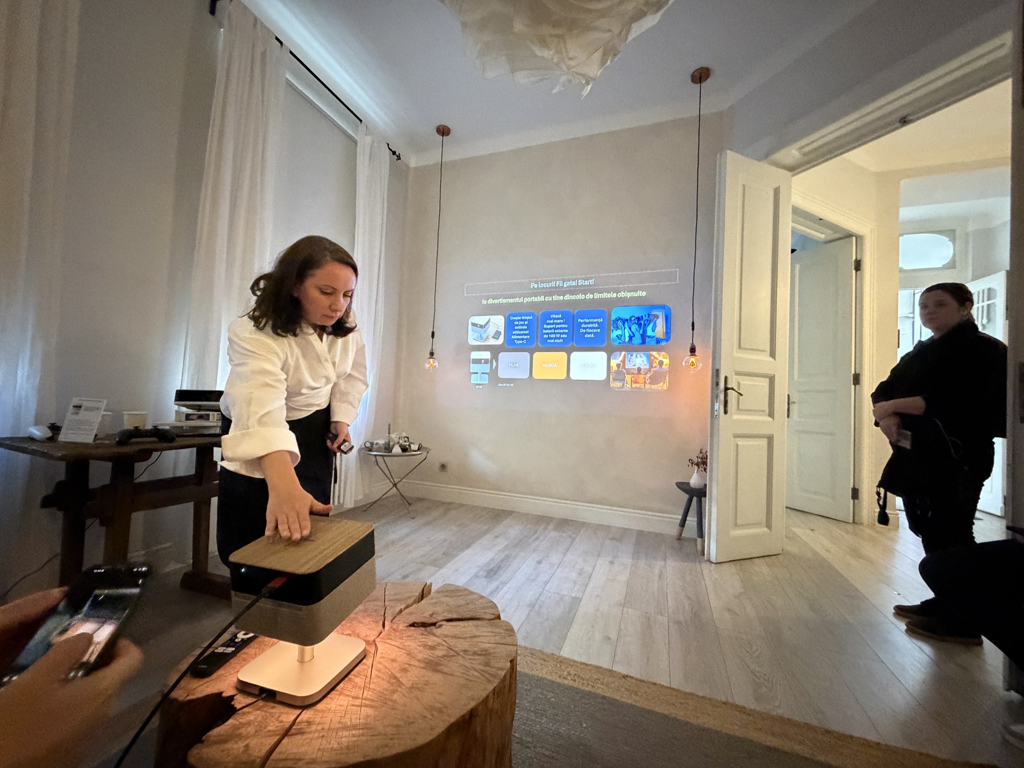 Şi uite aşa am ajuns şi la produsele momentului, videoproiectoarele Lifestudio. În total sunt vreo 7-8 modele, prezentate nouă într-o casă veche din Bucureşti, dar cu decor scandinav modern, Poem Boem îi zice. Lifestudio se împarte în două sub-game, Pop şi Flex. Prima o recunoşti prin acel picioruş, care face proiectorul să aducă cu o lampă.