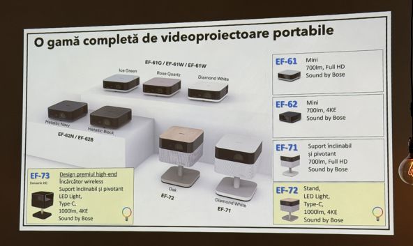 Gamele noi pornesc de la EF-61, mic şi compact, cu 700 lumens, Full HD şi trec la EF-62, 700 lumens şi 4K, ajungând apoi la EF-71, cu suport pivotant, FHD, 700 Lumens şi apoi la EF072, cu stând, iluminare LED, port USB-C, 1000 lumens, rezoluţie 4K.