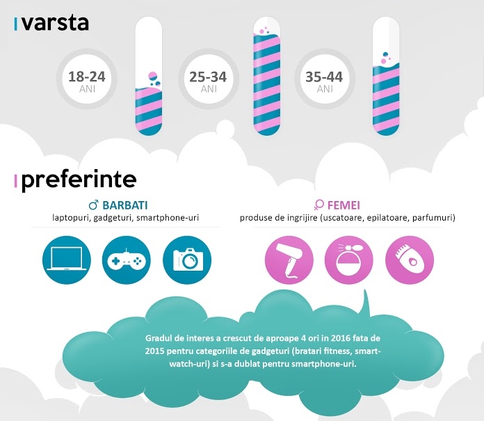 Studiul de piaţă a dezvăluit faptul că persoanele cu vârsta între 25 şi 34 de ani sunt cele mai active la shoppingul online, atât bărbaţii, cât şi femeile. Ei sunt urmaţi de cei din generaţia 35-44 de ani şi apoi generaţia 18-24. În 2015, femeile au devenit tot mai interesate de tehnologie, deşi există totuşi un ecart mare faţă de publicul masculin, care e mult mai interesat de cumpărături online.