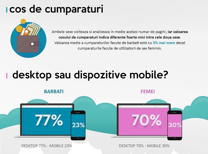 Consumatorul de sex feminin este în 2016 de 4 ori mai interesat de achiziţia de gadgeturi faţă de 2015 şi de două ori mai interesat când vine vorba de smartphone-uri. Ambele sex vizitează şi analizează în medie cam acelaşi număr de pagini web, iar valoarea coşului de cumpărături e similară, publicul masculin cheltuind totuşi cu 3% mai mult decât cel feminin.