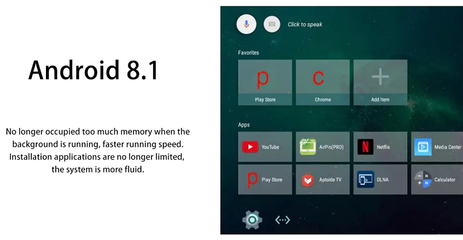 Aaparatul oferă Bluetooth 4.0, HDMI, suport pentru redare 4K, dar și suport pentru output audio 5.1 Surround. TV Box-ul oferă și un port RJ45, 1x USB 2.0, 1x USB 3.0, AV, cât și un port DV pentru alimentare. Se oferă alături de o telecomandă la pachet ce funcționează pe baza a două baterii AAA și dispozitivul se bazează pe o variantă modificată a lui Android 8.1 Oreo.
