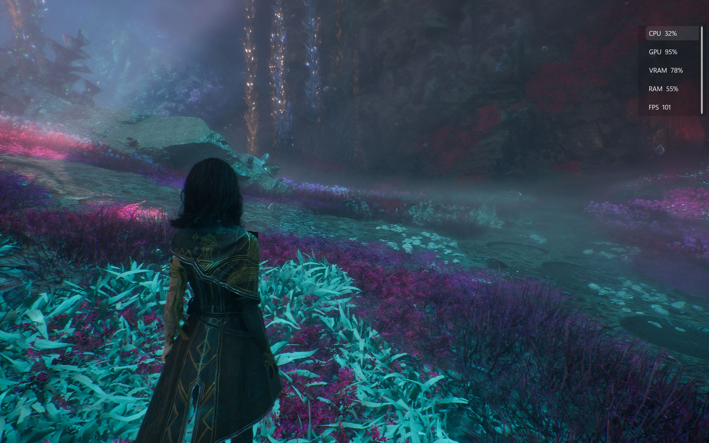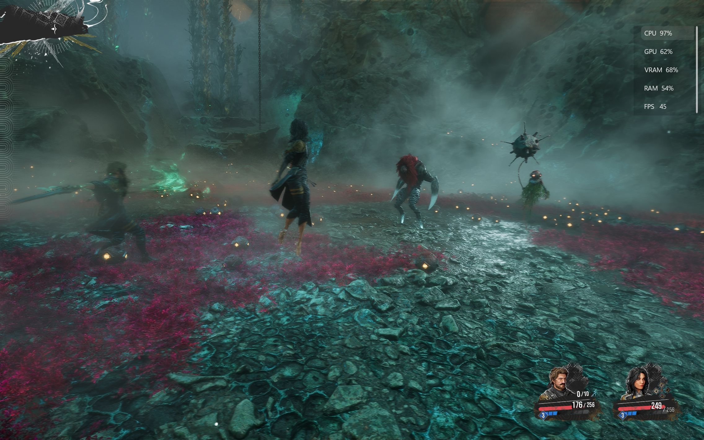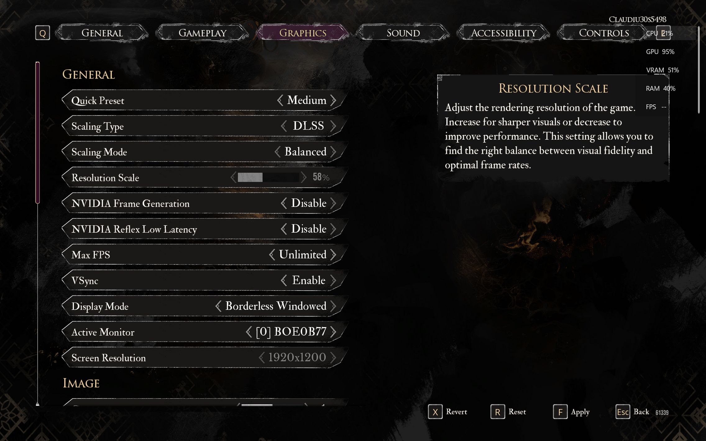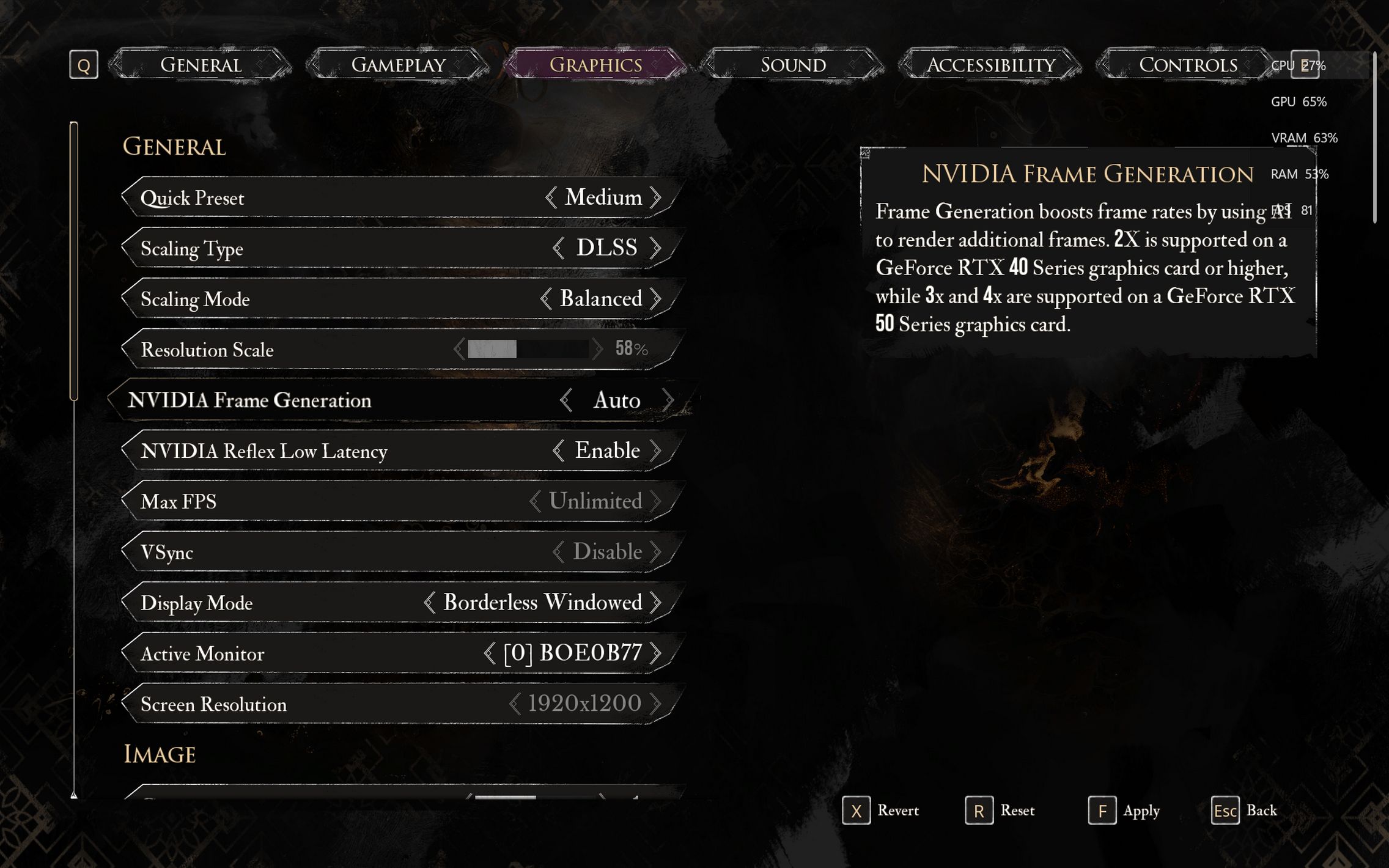 După o scurtă pauză de respiro, am trecut la jocul anului 2025 - Clair Obscur: Expedition 33, un titlu care m-a surprins încă din primele minute prin stilul artistic și atmosfera aparte. L-am rulat inițial pe setări medii, cu DLSS activ pe Balanced, NVIDIA Frame Generation dezactivat, la fel și Reflex Low Latency. Am păstrat VSync și motion blur active, iar la capitolul randare toate setările (anti-aliasing, umbre, reflexii, texturi etc.) au rămas pe mediu. Cu această configurație, jocul a rulat constant la 60–65 FPS, extrem de stabil, indiferent de mișcările camerei sau de acțiunile din timpul gameplay-ului. Fluiditatea era excelentă, iar experiența foarte plăcută. Lumea din Flying Waters se prezenta absolut fabulos, ca și culori, iluminare, design artistic.