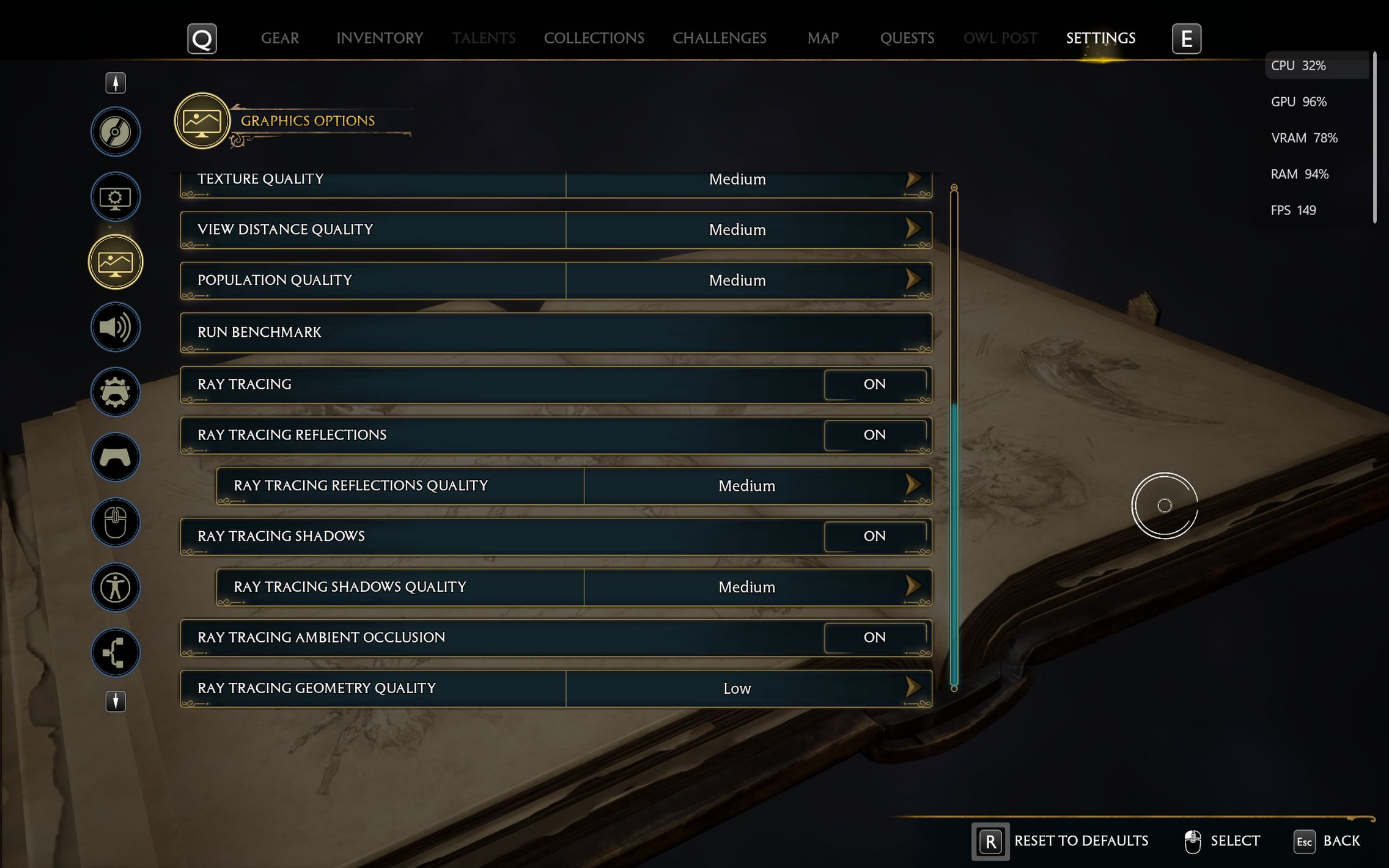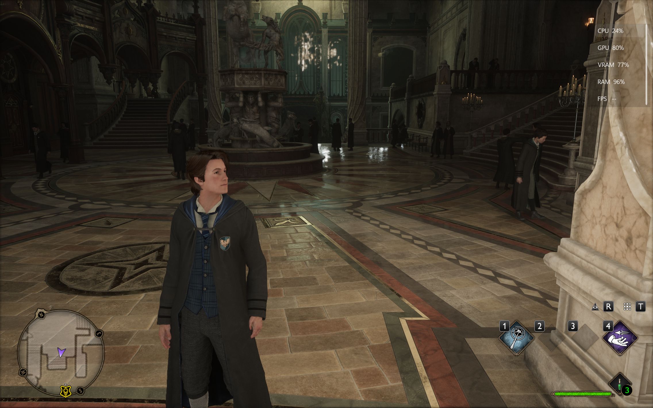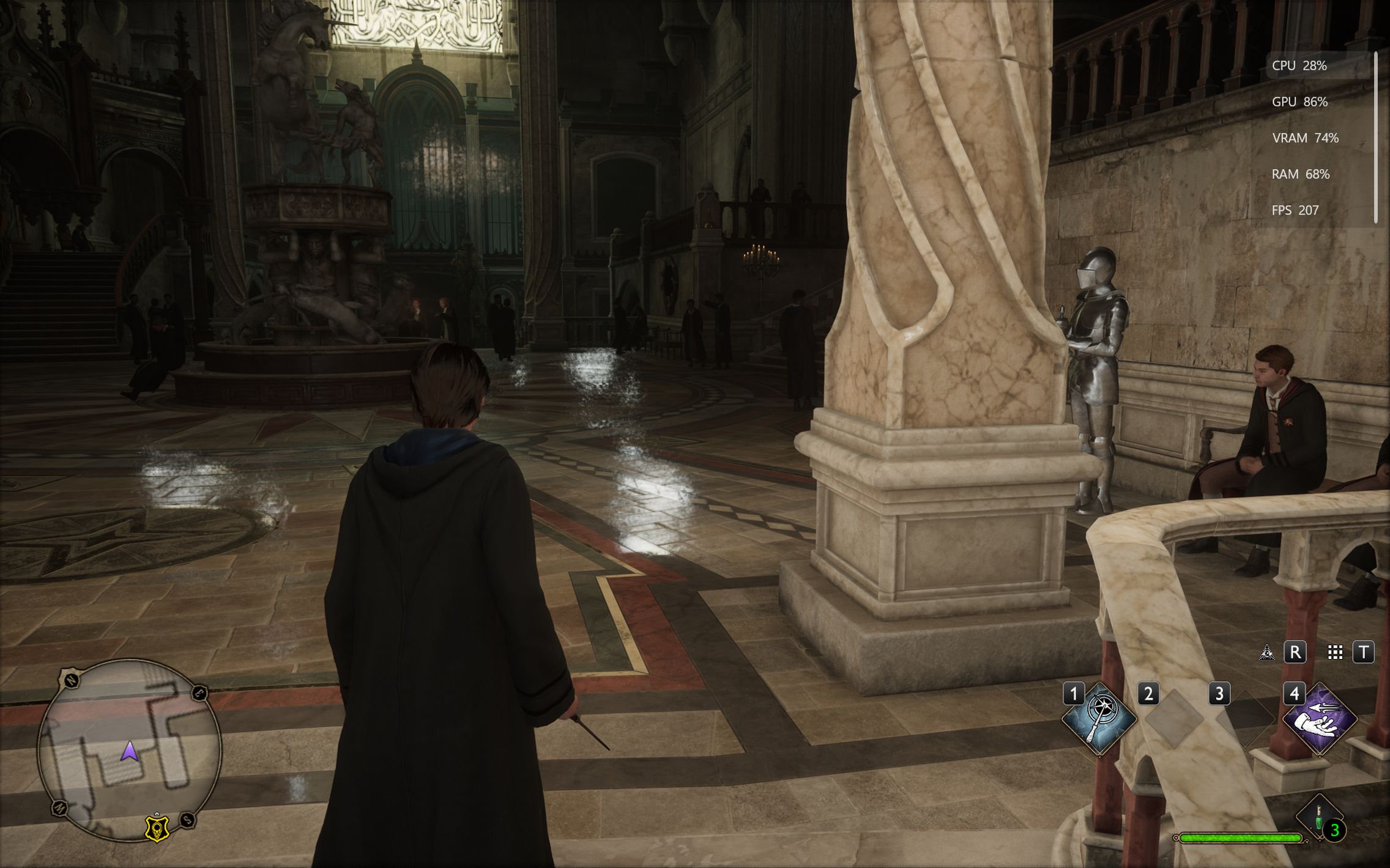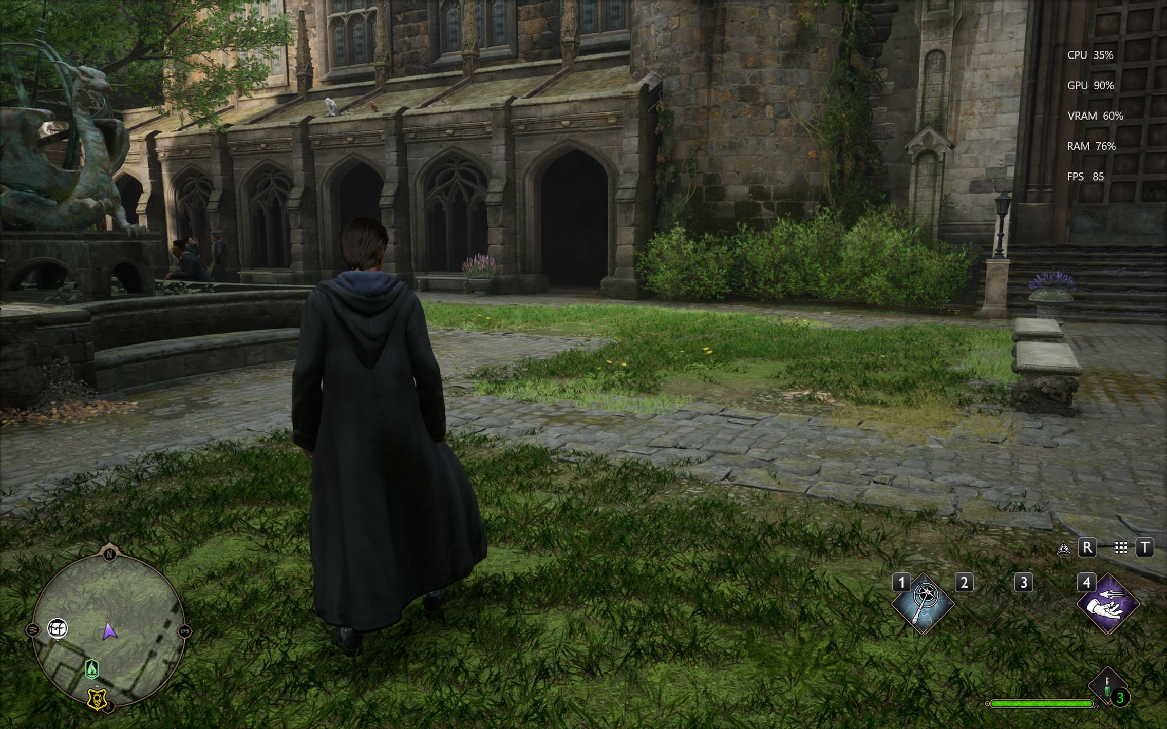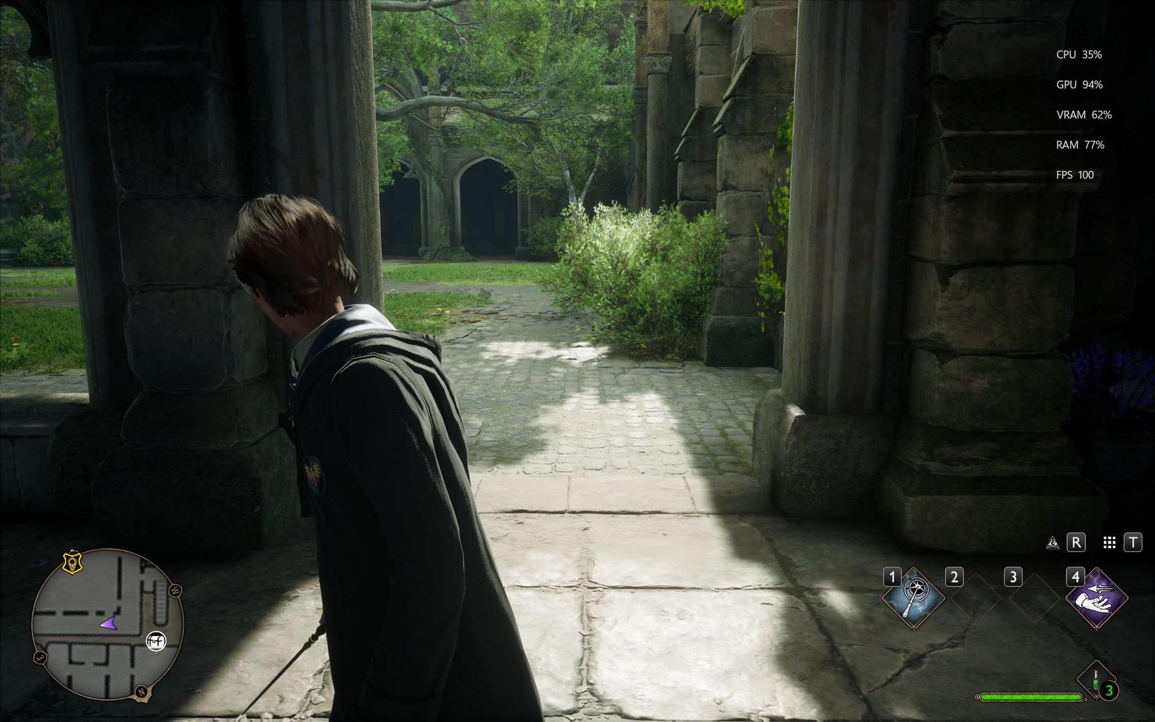 Următorul pas a fost activarea Ray Tracing pe mediu pentru reflexii, umbre și geometrie, cu ambient occlusion activ. Aici FPS-ul a scăzut, ajungând undeva între 80 și 100 FPS, însă câștigul vizual a fost evident. Reflexiile din sălile castelului, suprafețele lucioase și umbrele mult mai realiste adaugă un plus clar de profunzime și realism, fără ca jocul să-și piardă din fluiditate. La al treilea test am dus Ray Tracing-ul pe Ultra. Aici s-a simțit mai serios impactul asupra performanței, frame rate-ul coborând în jurul valorii de 70 FPS. Jocul arată superb în acest scenariu, iluminarea globală, reflexiile și detaliile fine ale mediului transformă lumea Hogwarts într-un adevărat spectacol vizual, însă este clar că plătești acest nivel de fidelitate cu FPS-uri.
