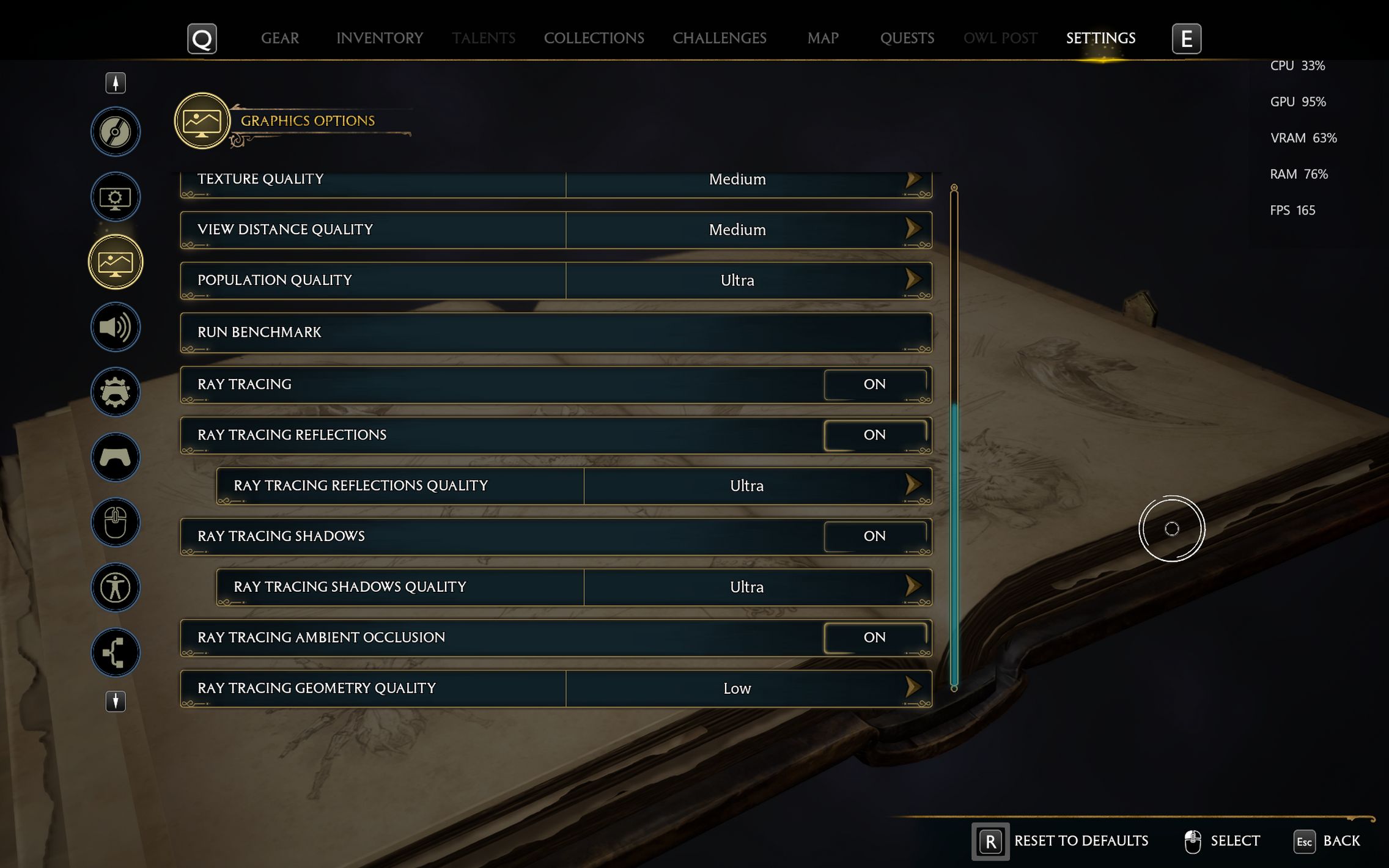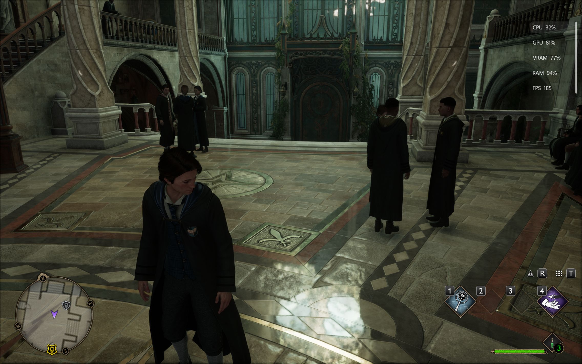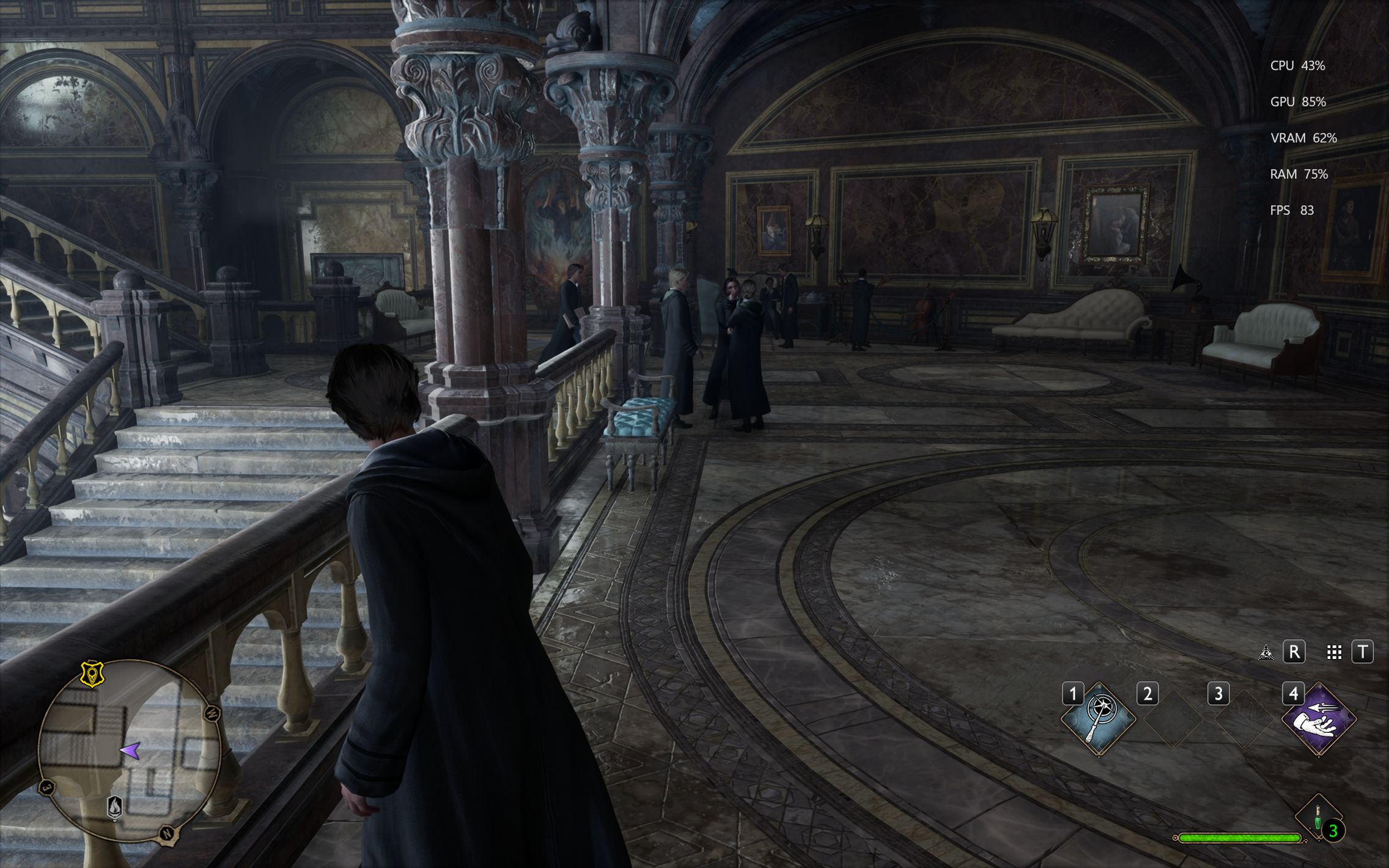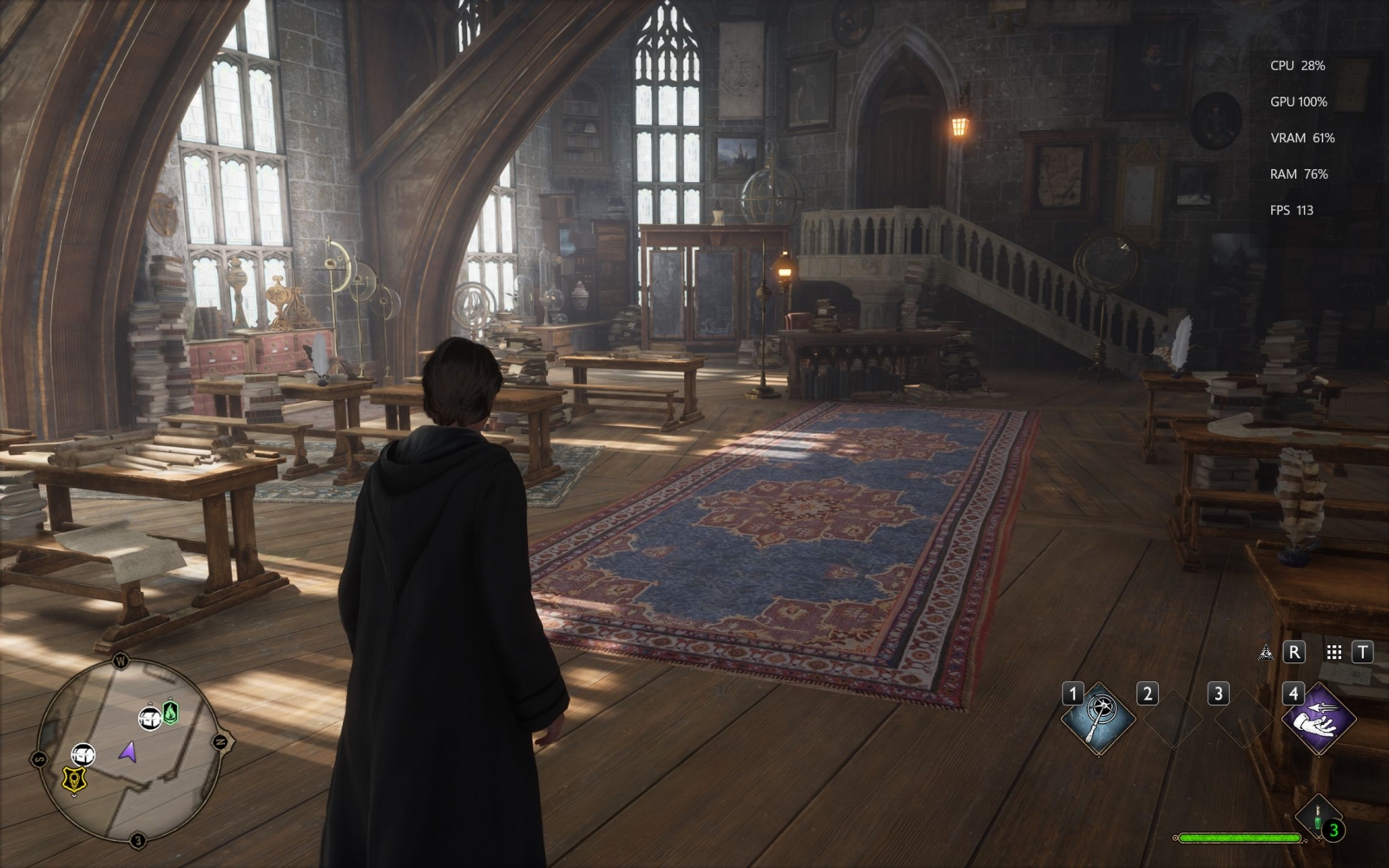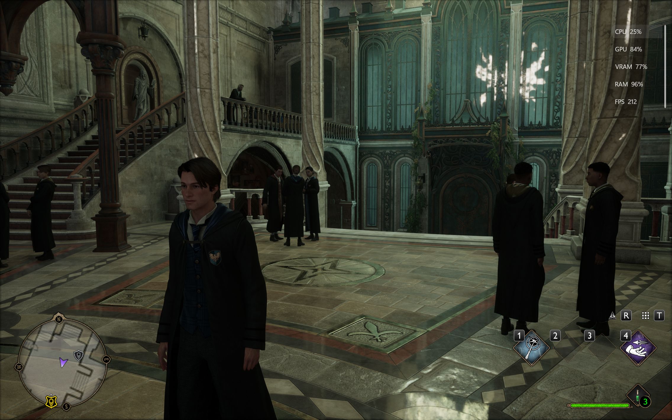 Următorul pas a fost activarea Ray Tracing pe mediu pentru reflexii, umbre și geometrie, cu ambient occlusion activ. Aici FPS-ul a scăzut, ajungând undeva între 80 și 100 FPS, însă câștigul vizual a fost evident. Reflexiile din sălile castelului, suprafețele lucioase și umbrele mult mai realiste adaugă un plus clar de profunzime și realism, fără ca jocul să-și piardă din fluiditate. La al treilea test am dus Ray Tracing-ul pe Ultra. Aici s-a simțit mai serios impactul asupra performanței, frame rate-ul coborând în jurul valorii de 70 FPS. Jocul arată superb în acest scenariu, iluminarea globală, reflexiile și detaliile fine ale mediului transformă lumea Hogwarts într-un adevărat spectacol vizual, însă este clar că plătești acest nivel de fidelitate cu FPS-uri.