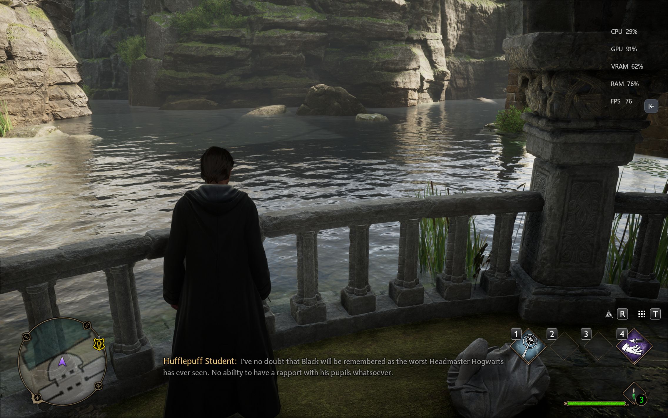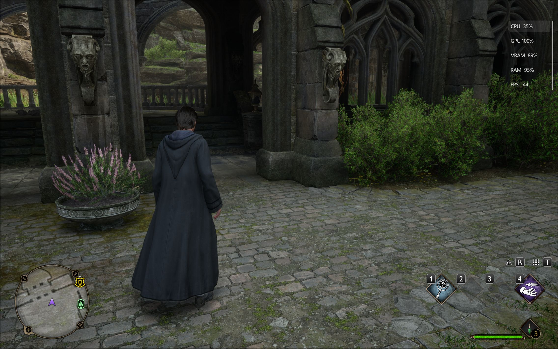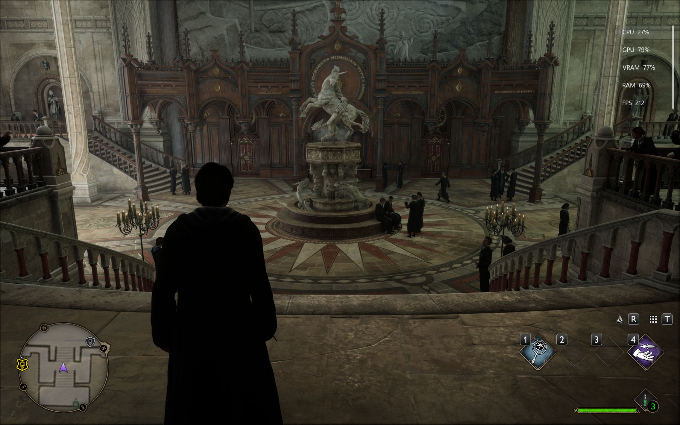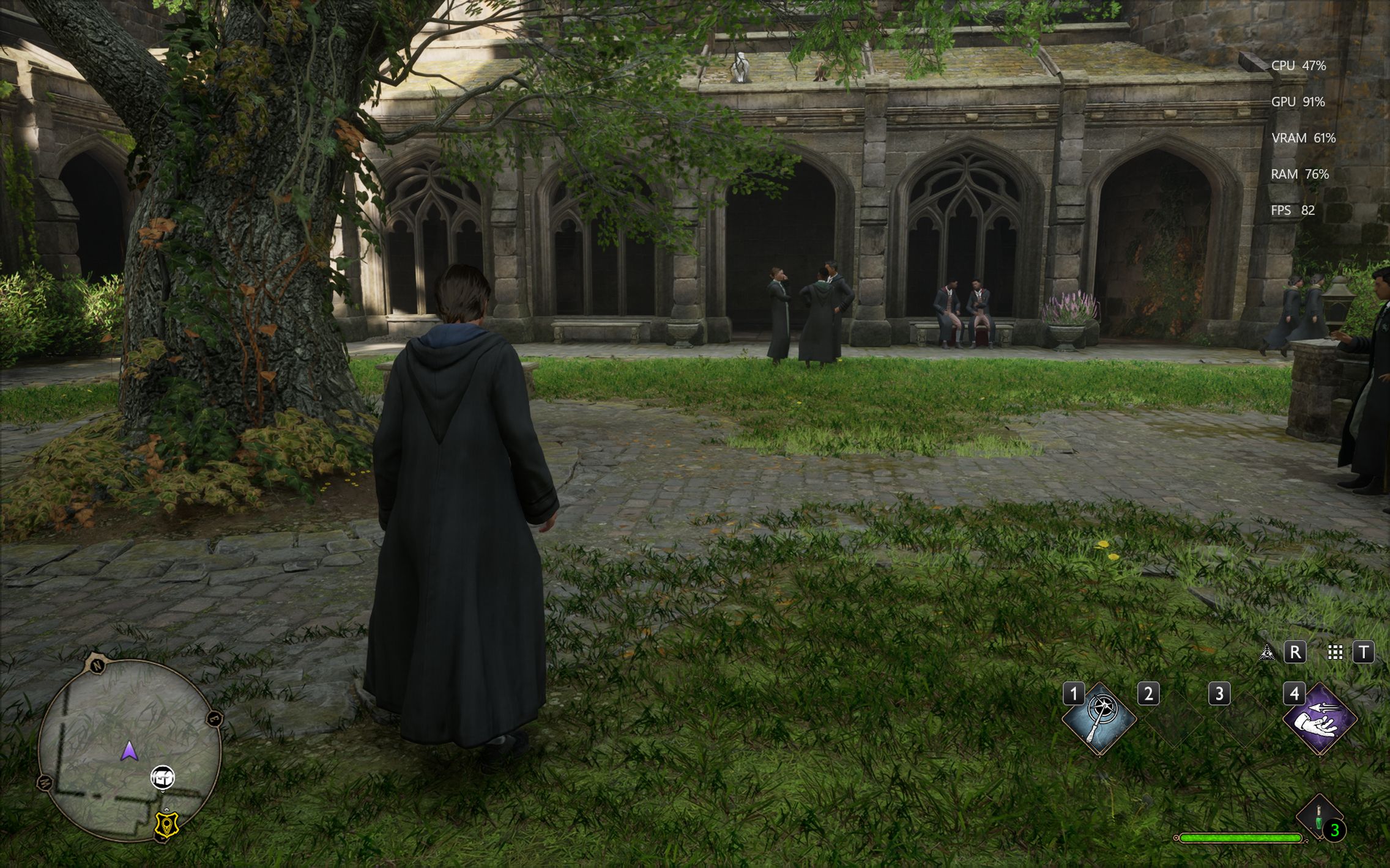 Următorul pas a fost activarea Ray Tracing pe mediu pentru reflexii, umbre și geometrie, cu ambient occlusion activ. Aici FPS-ul a scăzut, ajungând undeva între 80 și 100 FPS, însă câștigul vizual a fost evident. Reflexiile din sălile castelului, suprafețele lucioase și umbrele mult mai realiste adaugă un plus clar de profunzime și realism, fără ca jocul să-și piardă din fluiditate. La al treilea test am dus Ray Tracing-ul pe Ultra. Aici s-a simțit mai serios impactul asupra performanței, frame rate-ul coborând în jurul valorii de 70 FPS. Jocul arată superb în acest scenariu, iluminarea globală, reflexiile și detaliile fine ale mediului transformă lumea Hogwarts într-un adevărat spectacol vizual, însă este clar că plătești acest nivel de fidelitate cu FPS-uri.