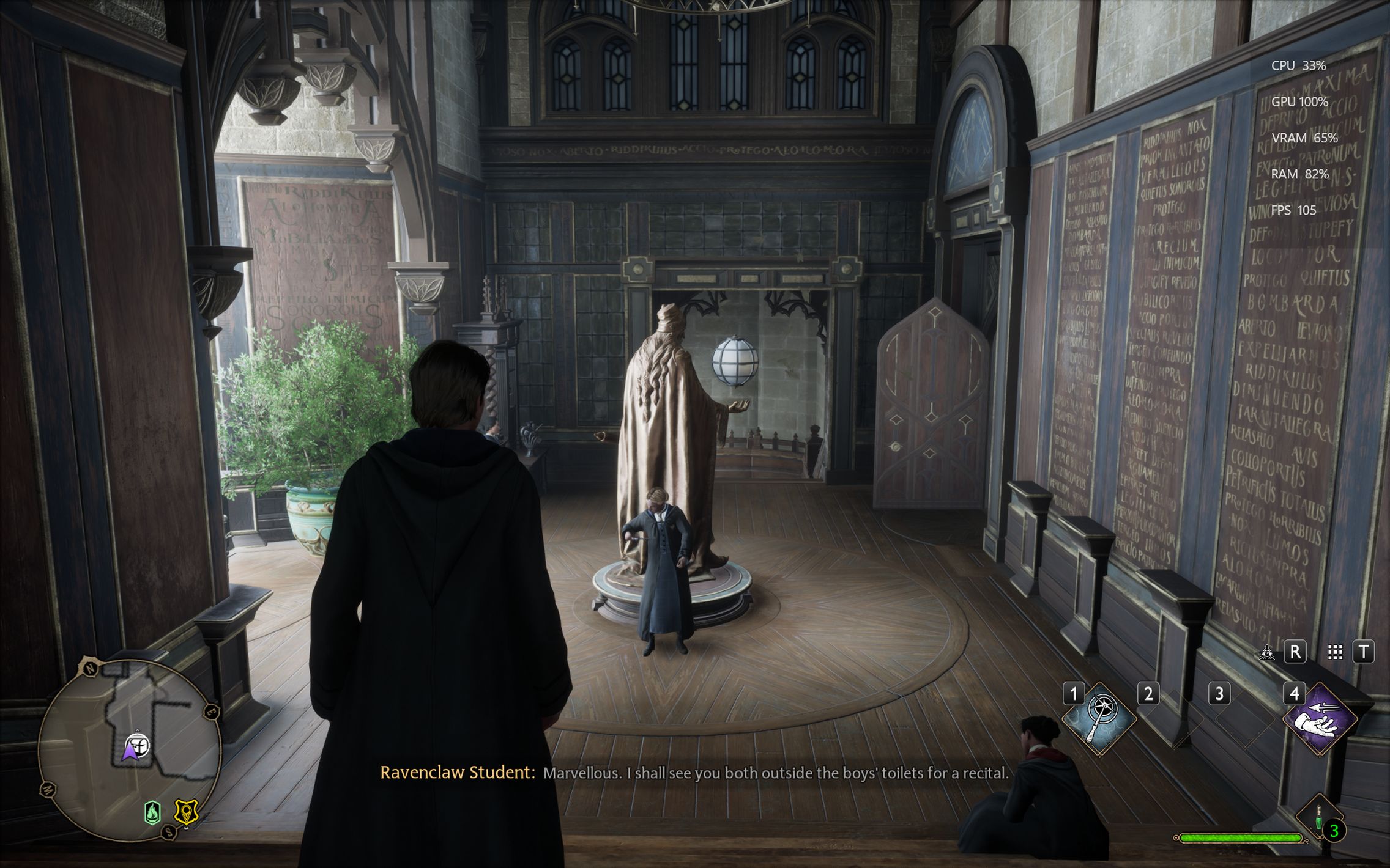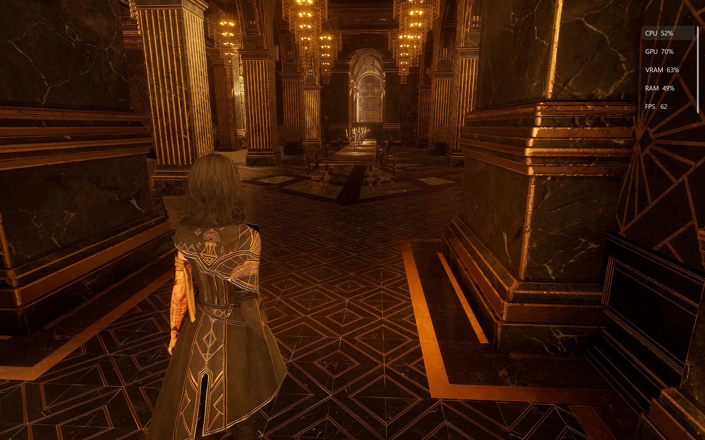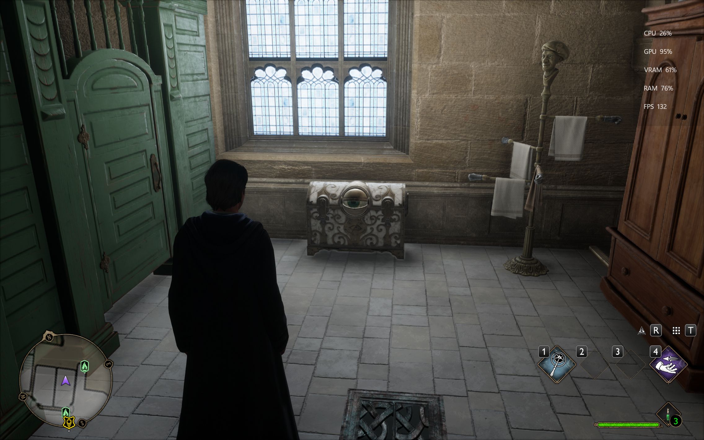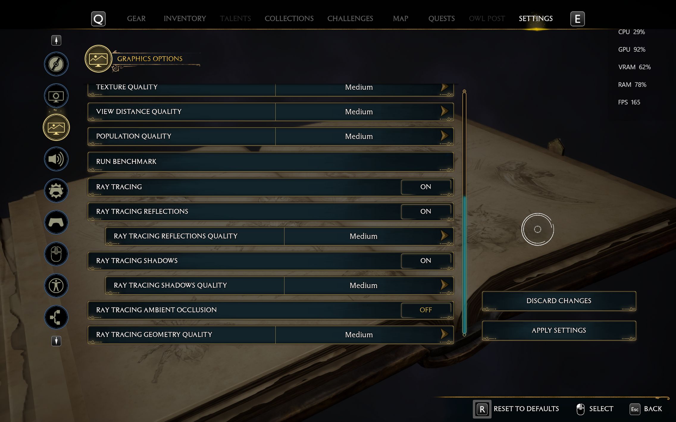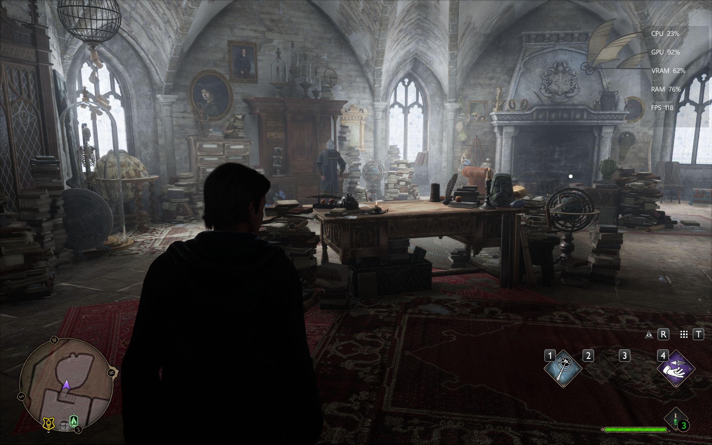 Următorul pas a fost activarea Ray Tracing pe mediu pentru reflexii, umbre și geometrie, cu ambient occlusion activ. Aici FPS-ul a scăzut, ajungând undeva între 80 și 100 FPS, însă câștigul vizual a fost evident. Reflexiile din sălile castelului, suprafețele lucioase și umbrele mult mai realiste adaugă un plus clar de profunzime și realism, fără ca jocul să-și piardă din fluiditate. La al treilea test am dus Ray Tracing-ul pe Ultra. Aici s-a simțit mai serios impactul asupra performanței, frame rate-ul coborând în jurul valorii de 70 FPS. Jocul arată superb în acest scenariu, iluminarea globală, reflexiile și detaliile fine ale mediului transformă lumea Hogwarts într-un adevărat spectacol vizual, însă este clar că plătești acest nivel de fidelitate cu FPS-uri.