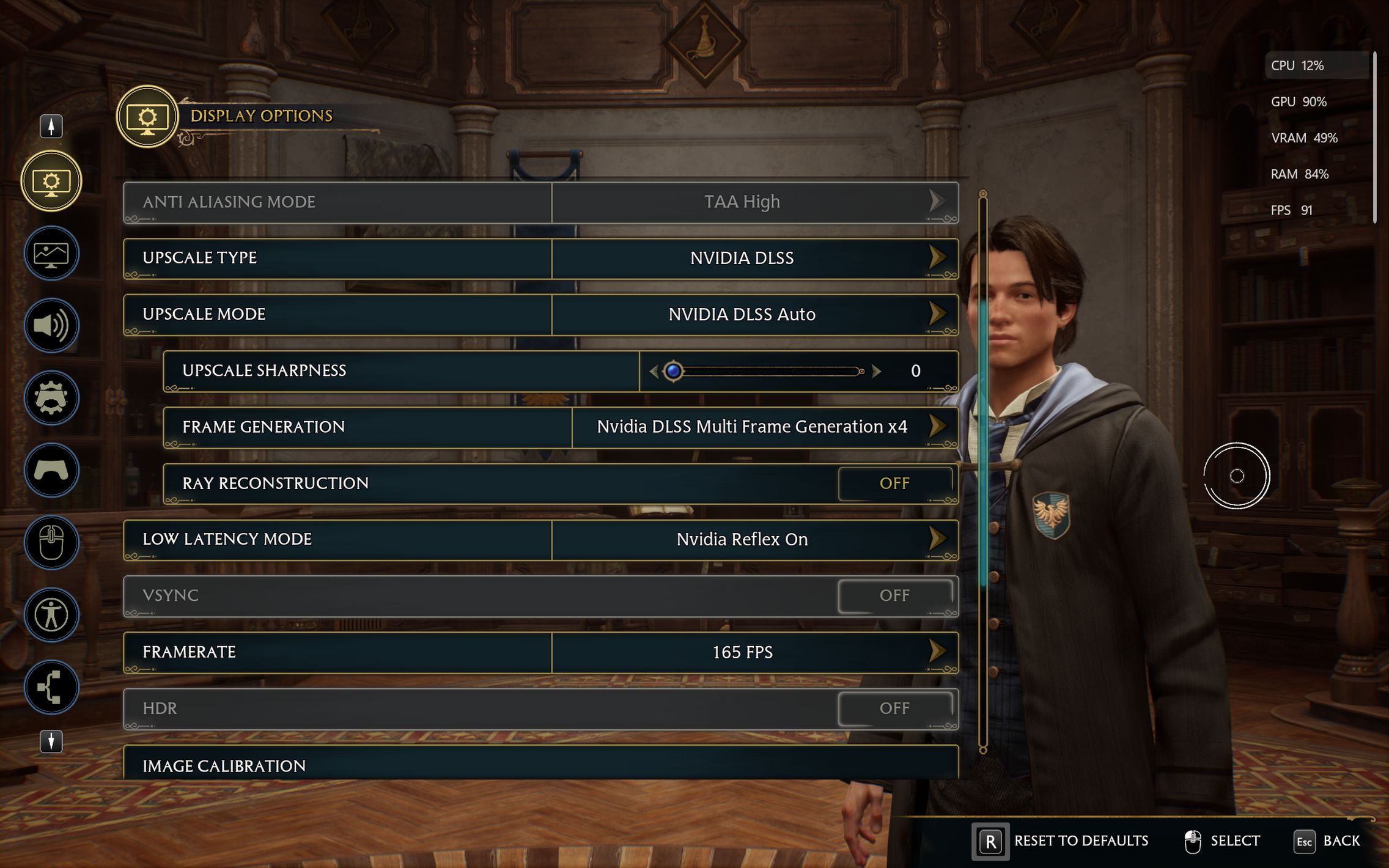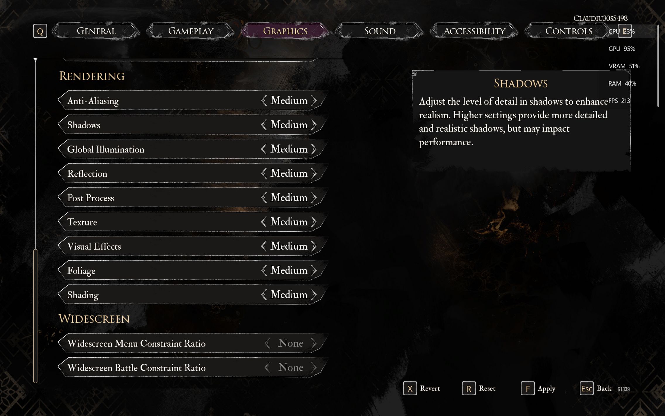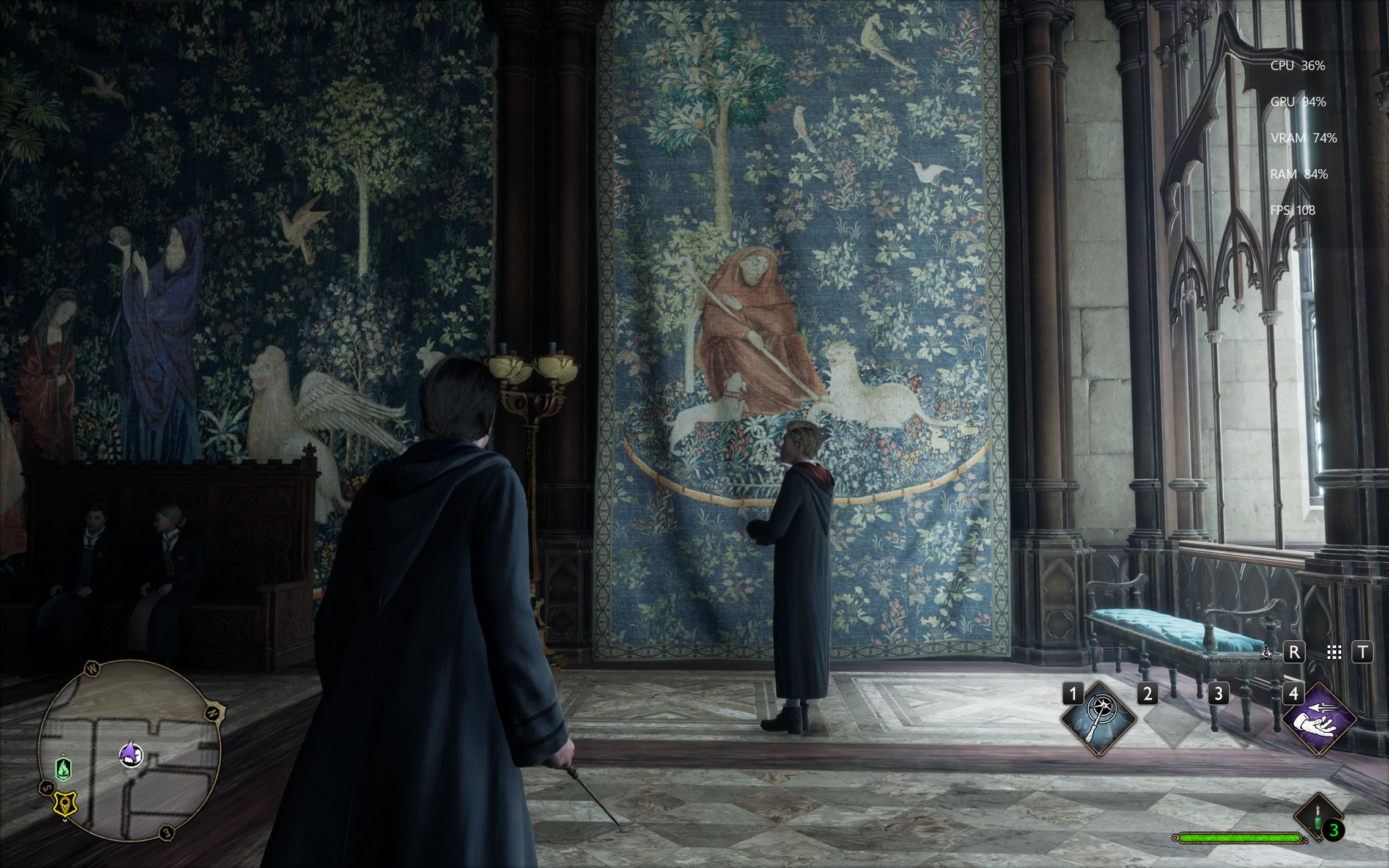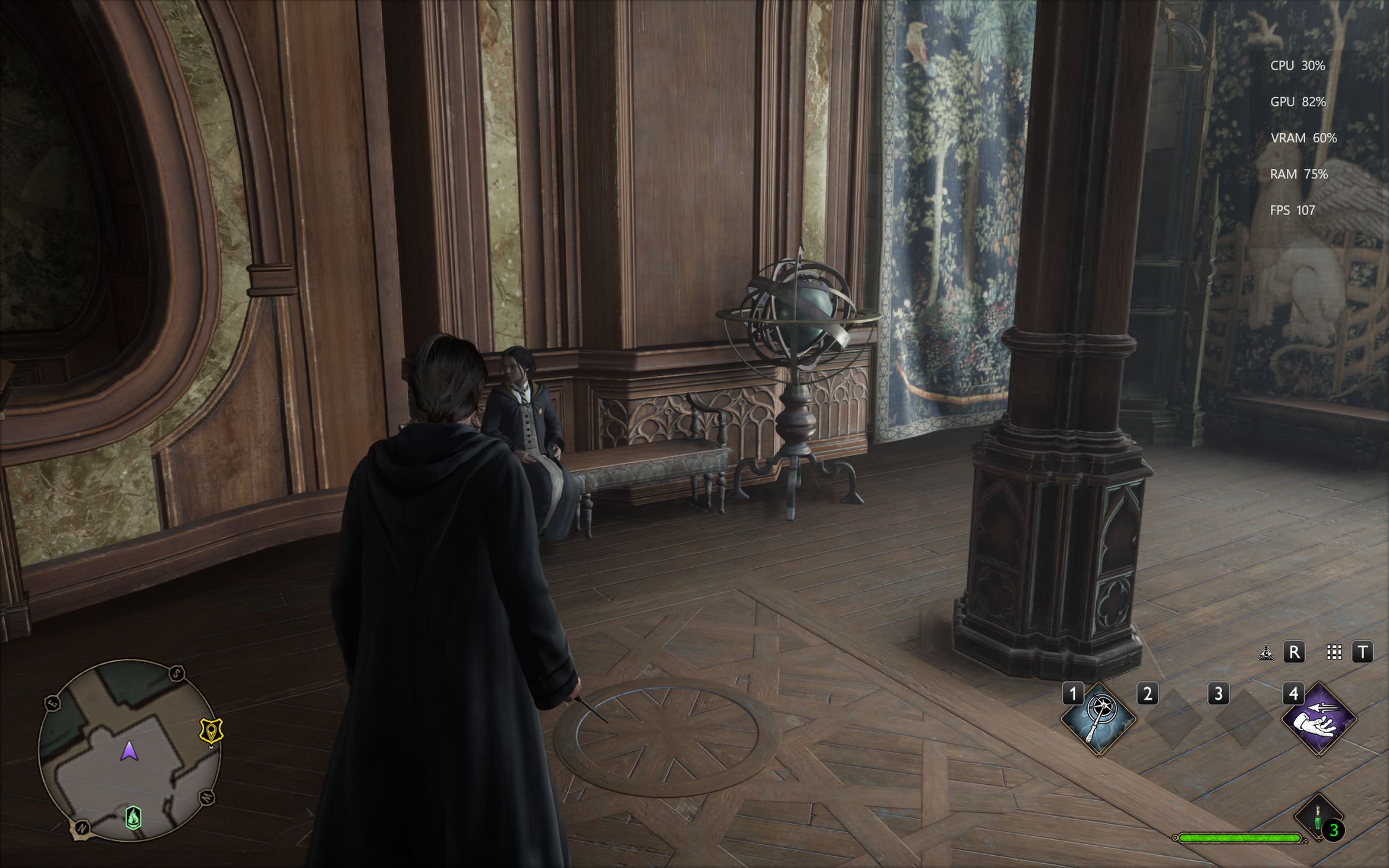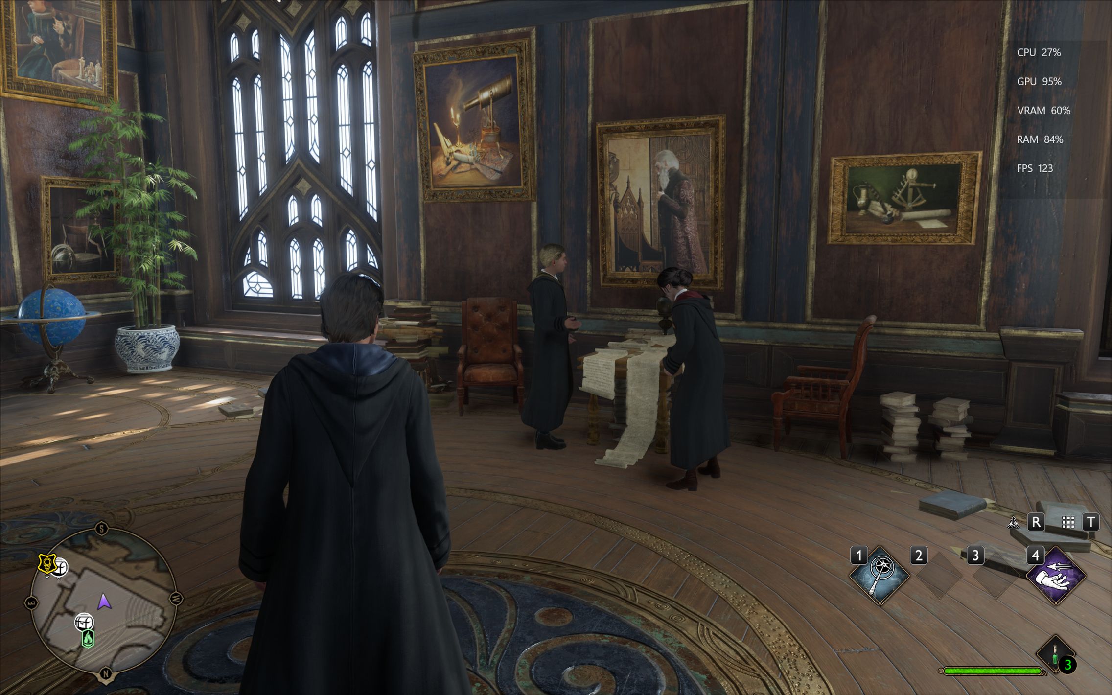 Următorul pas a fost activarea Ray Tracing pe mediu pentru reflexii, umbre și geometrie, cu ambient occlusion activ. Aici FPS-ul a scăzut, ajungând undeva între 80 și 100 FPS, însă câștigul vizual a fost evident. Reflexiile din sălile castelului, suprafețele lucioase și umbrele mult mai realiste adaugă un plus clar de profunzime și realism, fără ca jocul să-și piardă din fluiditate. La al treilea test am dus Ray Tracing-ul pe Ultra. Aici s-a simțit mai serios impactul asupra performanței, frame rate-ul coborând în jurul valorii de 70 FPS. Jocul arată superb în acest scenariu, iluminarea globală, reflexiile și detaliile fine ale mediului transformă lumea Hogwarts într-un adevărat spectacol vizual, însă este clar că plătești acest nivel de fidelitate cu FPS-uri.