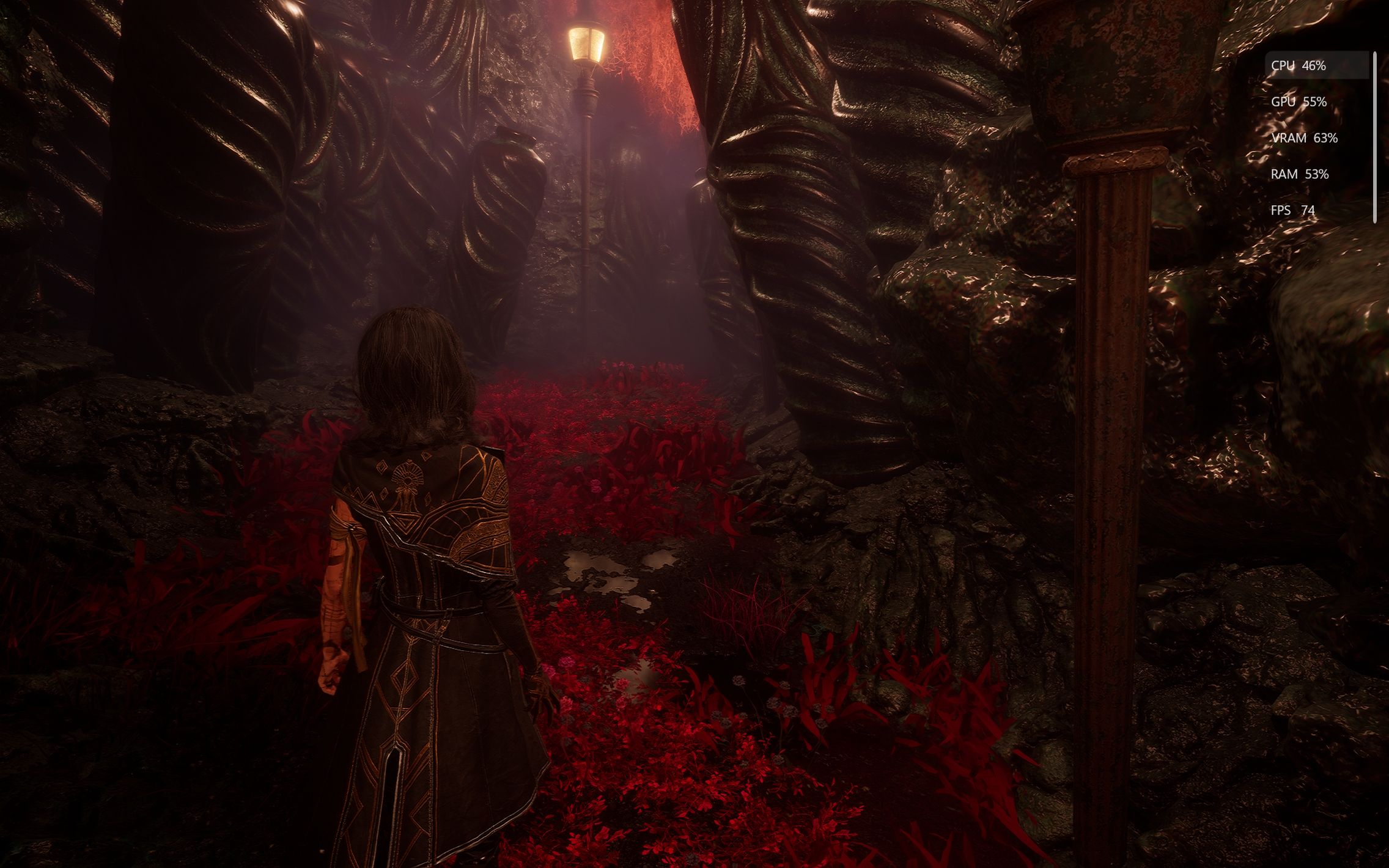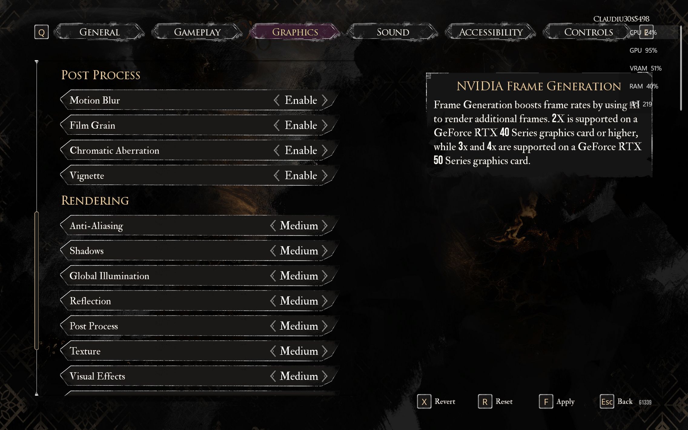 Ulterior, am activat NVIDIA Frame Generation, jocul informându-mă că pentru placa mea RTX este suportat frame adițional 3x și 4x. Diferența a fost instantanee: FPS-ul a sărit imediat la 130–140, ba chiar 150 FPS, fără nicio pierdere de fluiditate sau apariția de artefacte vizuale. În anumite momente am văzut chiar și 160 FPS, lucru care a făcut ca mișcarea personajului și tranzițiile camerei să fie incredibil de line. Surprinzător, nici măcar atunci când am urcat setările de randare pe High, performanța nu a avut de suferit dramatic. FPS-ul s-a menținut în zona de 130–140, iar câștigul vizual a fost evident. Pentru cine vrea calitate ridicată fără compromisuri serioase la fluiditate, această configurație este, fără îndoială, cea ideală.