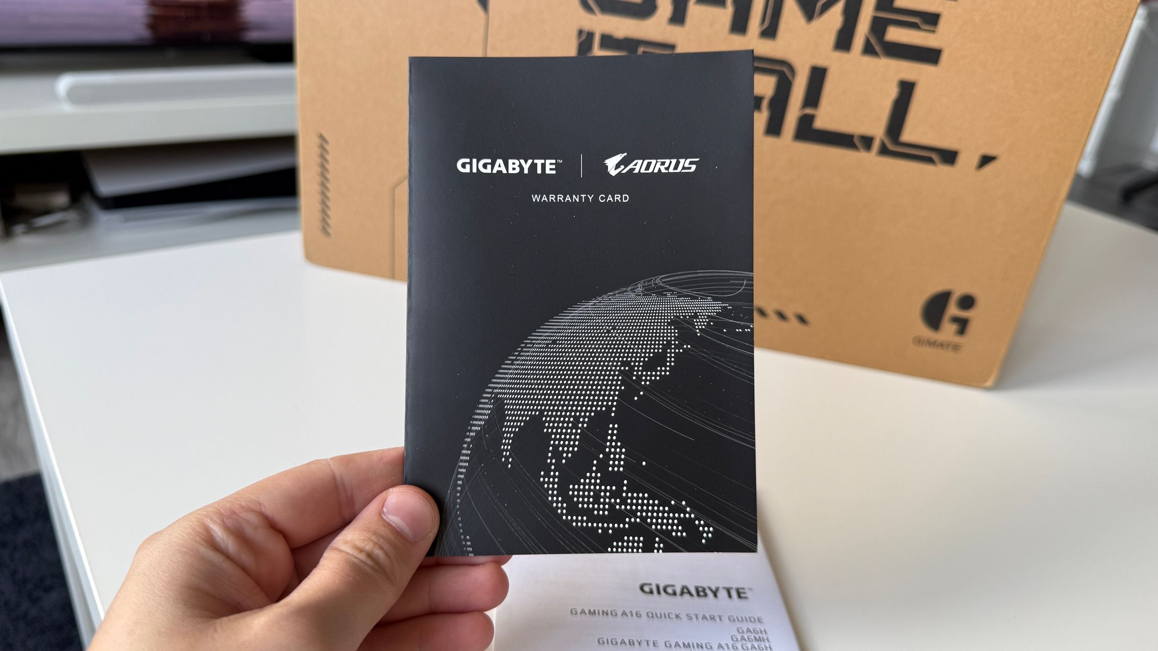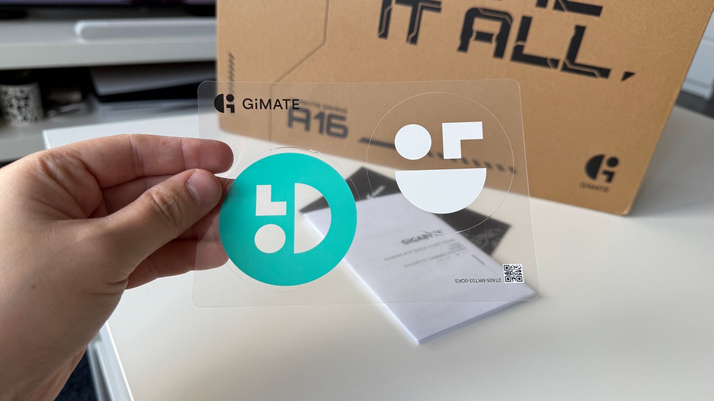 Laptop-urile nu prea aduc cine știe ce în pachet, fie ele scumpe, ieftine, de gaming sau de productivitate. GIGABYT A16 nu face excepție astfel că la interior am găsit garanția, manualul de utilizare și adaptorul separat în două, cu "cărămida" la un capăt și ștecherul la alta. Îmbinate aduc încărcare 120W AC. Și desigur laptop-ul în pachet. Bonusul sunt câteva stickere pe care GIGABYTE le-a inclus aici!